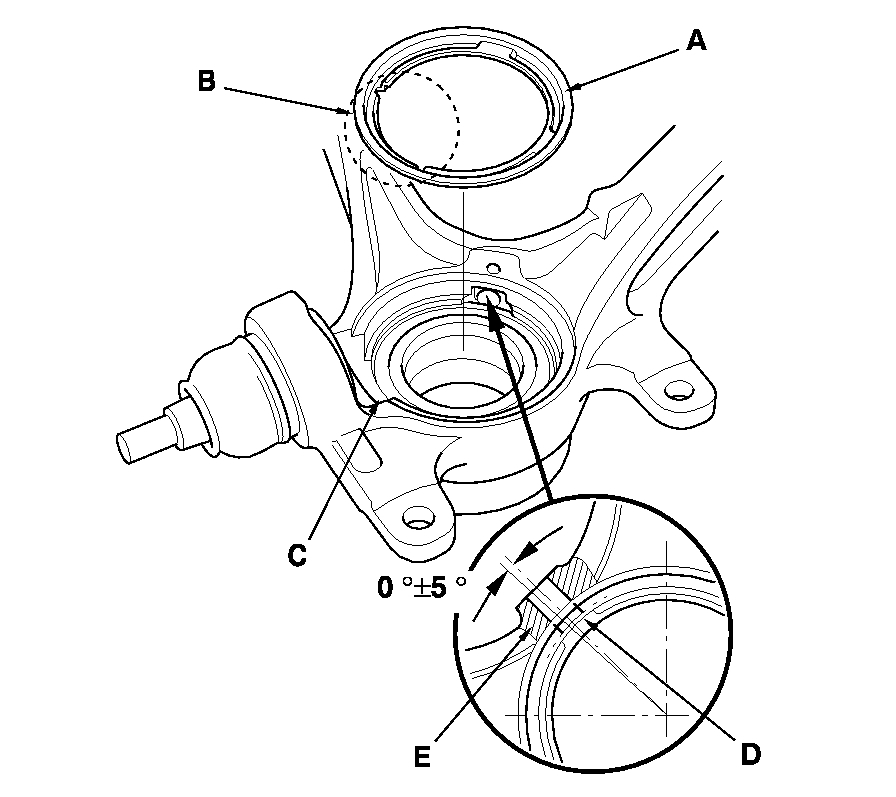 NOTE: When installing the new front knuckle ring, position the knuckle ring notch portion (B) toward cut out (C) near the ball joint in the knuckle, and align the center of the knuckle ring ledge portion (D) with the center of the wheel sensor hole (E) on the knuckle as shown.