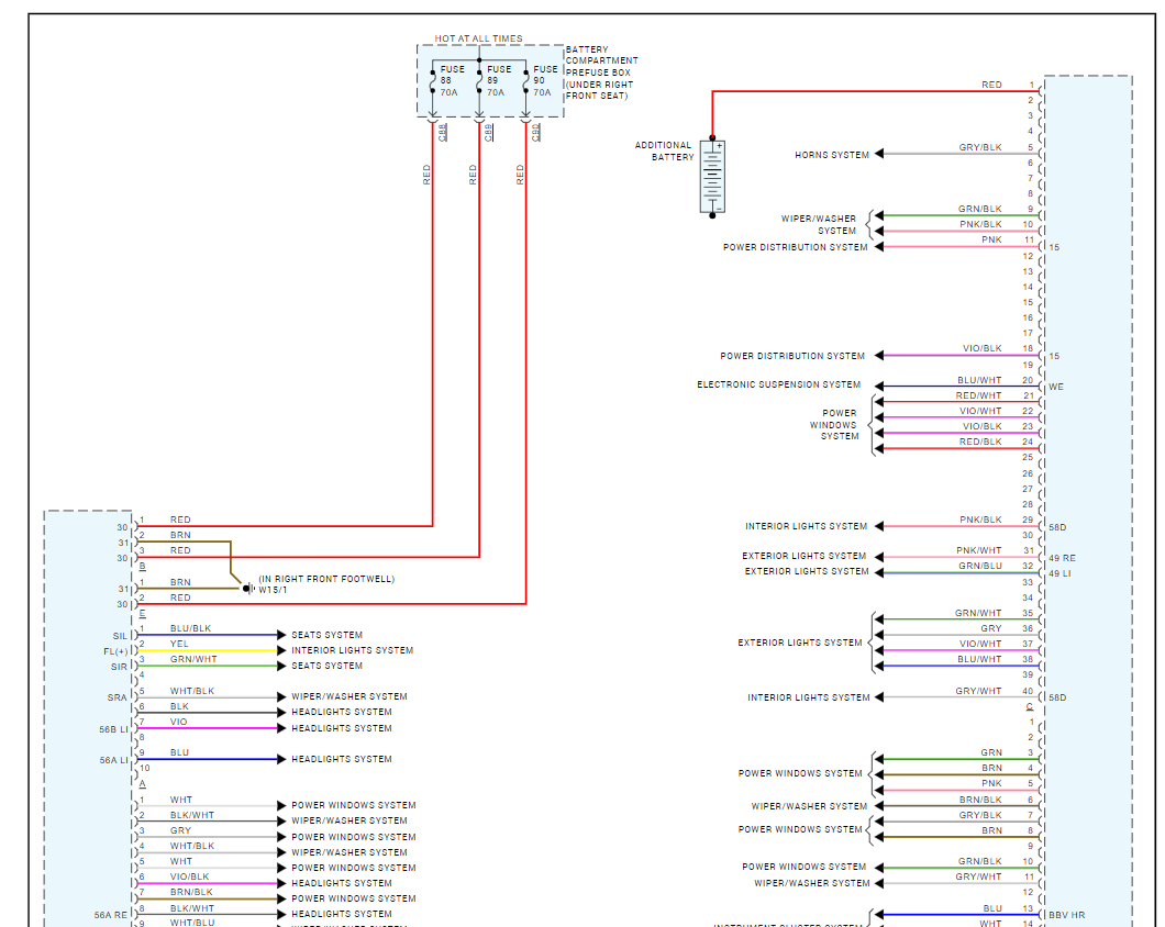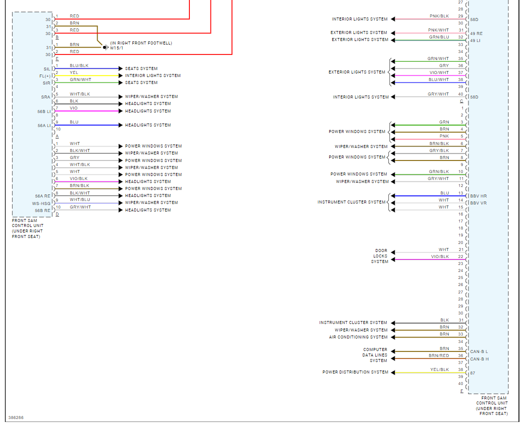 I am looking for the wiring diagram of the front SAM that shows the connectors so I can try and track these circuits down and make sure there are no other wiring faults. The water level was about halfway up the bottom connectors, so some things definitely shorted out. I was able to determine that the washer pump is on the 'D' connector. 'A' and 'D' were immersed in water. Also, does anyone know if an ML SAM would be plug and play or should I expect options differences and SDS programming? They have the same part number.