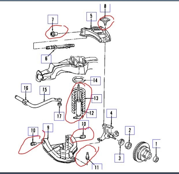 I would have someone check the suspension for you but the bushings I circled are common for wearing out and causing the noise.