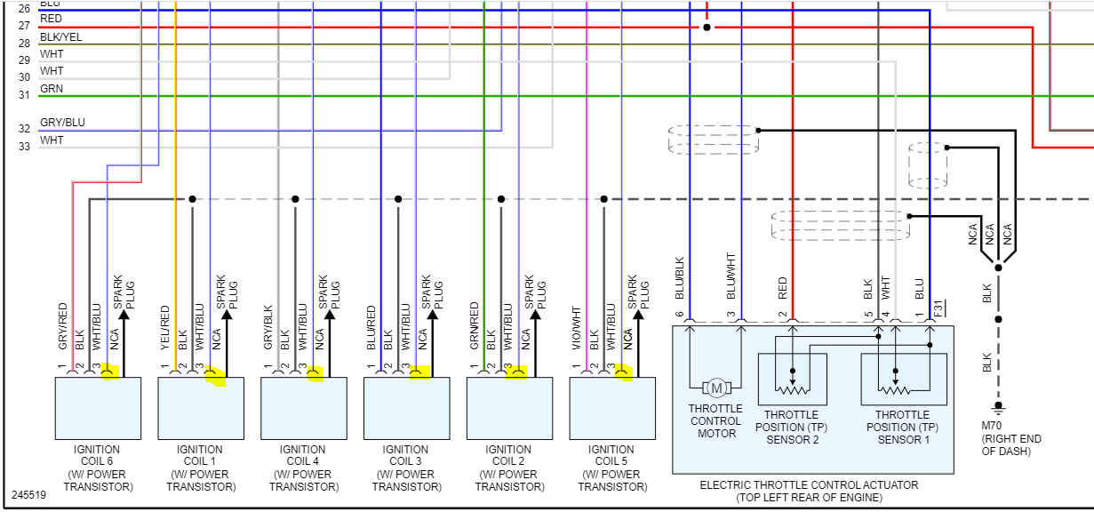 Using injector 1 in the schematic as an example, touch the test lamp to the yellow wire with a red tracer and have a helper crank the engine. The test lamp should strobe on and off. If it doesn't or stays on constantly, either we have a faulty ECM (engine control module) or a wiring issue.