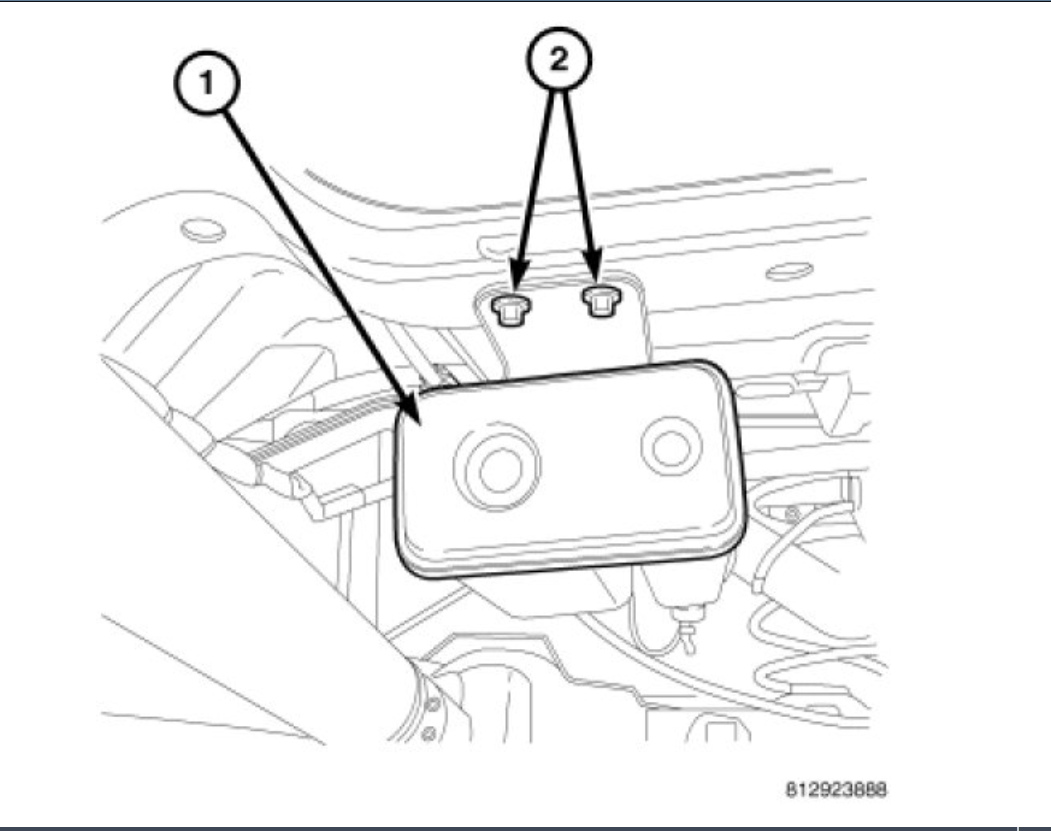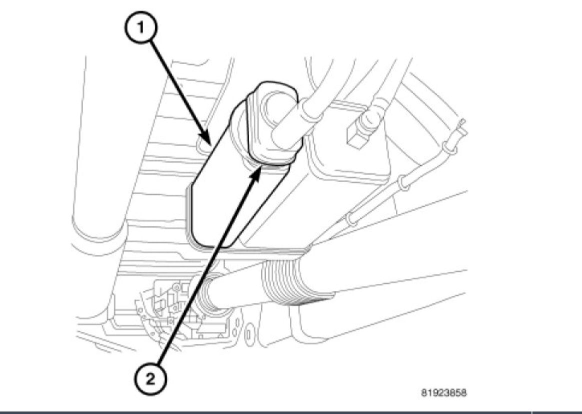 The EVAP canister (1) is located under the vehicle next to the rear prop shaft. The ESIM switch (2) is attached to the EVAP canister.