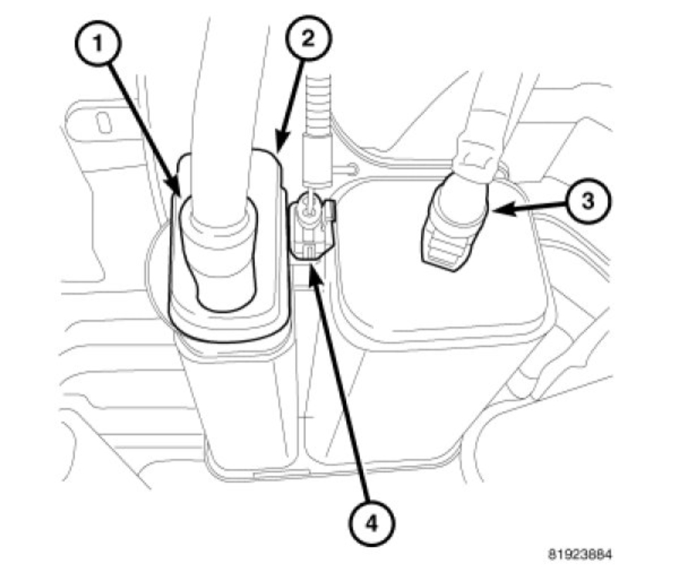 8. To separate EVAP canister (4) from mounting bracket (1), pry on lock-tab (2).