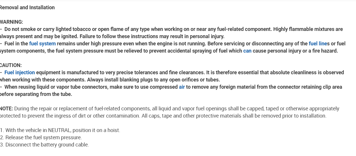 - Fuel in the fuel system remains under high pressure even when the engine is not running. Before servicing or disconnecting any of the fuel lines or fuel system components, the fuel system pressure must be relieved to prevent accidental spraying of fuel, which can cause personal injury or a fire hazard.