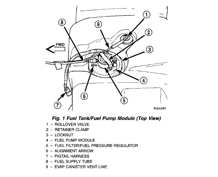 6. The arrow (Fig. 21) molded into top of fuel pump module should be pointed towards front of vehicle (12 o'clock position).
