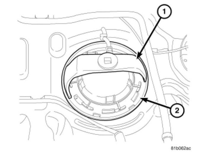 5. Install fuel pump module lock ring tool 9340 (1) and turn counter-clockwise to remove the fuel pump module lock ring (2).