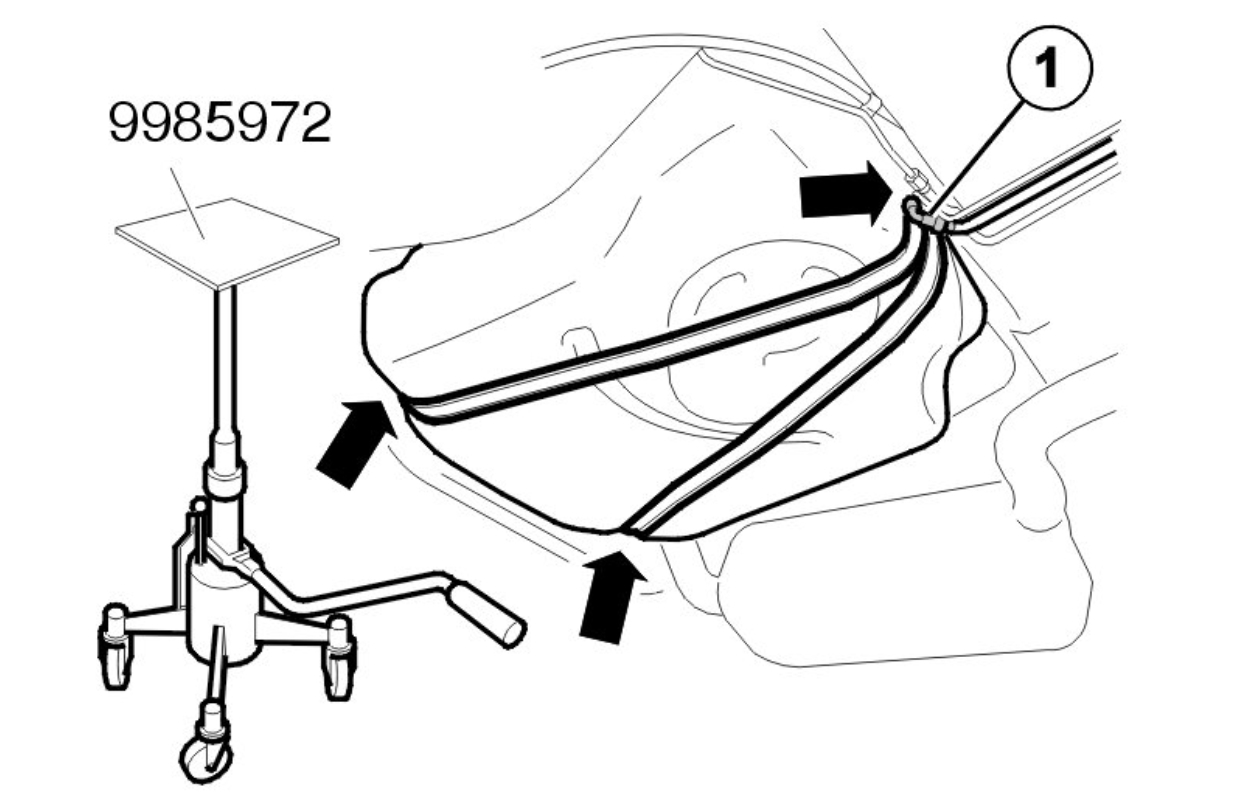 Place the tank on the mobile jack together with fixture: 999 5972 FIXTURE See: Vehicle > Electrical / Mechanical Repair > 999 5972 Fixture.