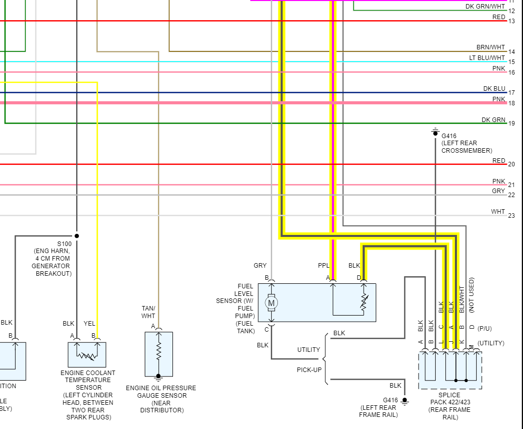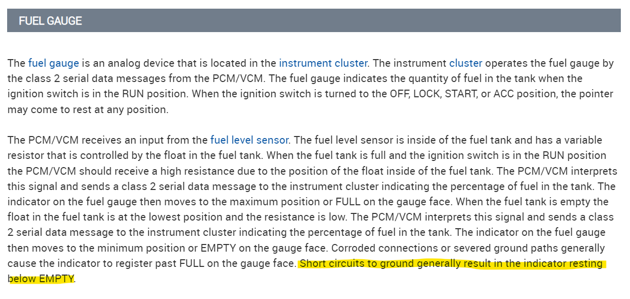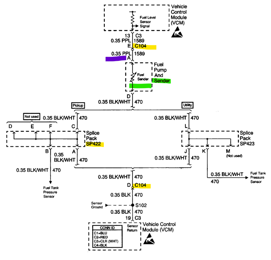 Hello, I'll post the wring diagrams for your truck, both setups look the same, but the fuel level assembly has a ground that runs through a splice pack on the rear frame rail and then out to the ECM sensor ground. So, there may be an issue in the splice pack. The black wire is the sensor ground, and there may be some corrosion in the splice pack causing high resistance in the circuit.