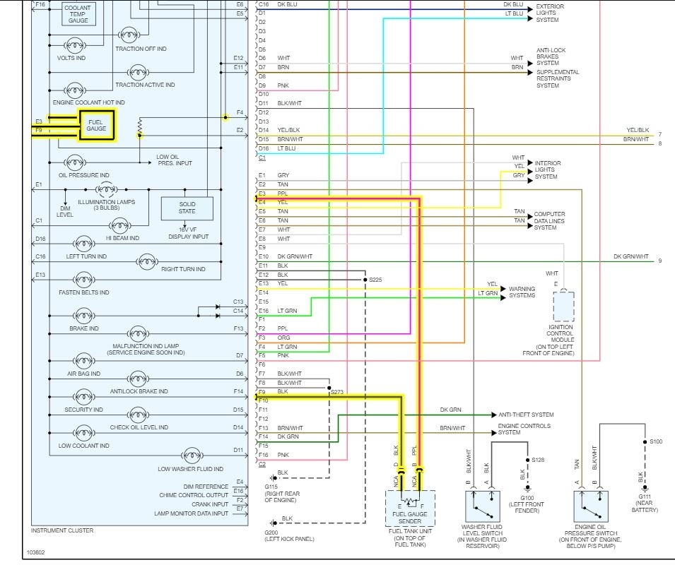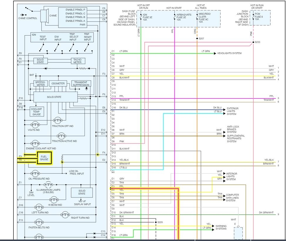 The fuel gauge stays at one position full or empty. I changed the sending unit in tank stayed the same, so I pulled the instrument cluster and put a new gauge a little change but still not reading. found two wires going to tank pink one and a dark color one checked with test light pink light up dark one no light. checked all fuses, no help. did notice when I unplugged the wires to tank gauge went to the far right. any help?