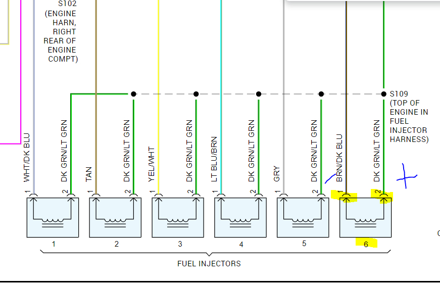 Here is what I need you to do: At the number 6 injector wire there will be a dark green wire with a light green tracer. All injectors will have one wire that is this color. This is the power supply to the injector. With the key on (run position/engine not running) that wire should have 12v power. Check if the one for cylinder 6 has power.