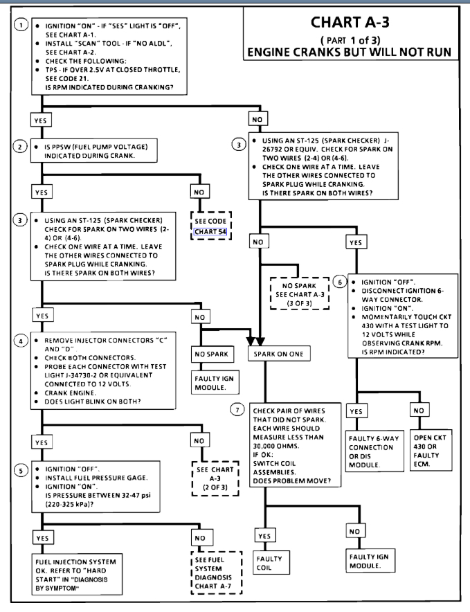 the first thing is says connect to scan tool, mine does not have a OBD2. I've jumped and be with a paperclip and read the flash codes and I'm not getting no codes just the 1 -1 2, 1 -,1 2 1-1 2. It says if I don't have that connector to go to chart 2 only have chart 3 I sent.