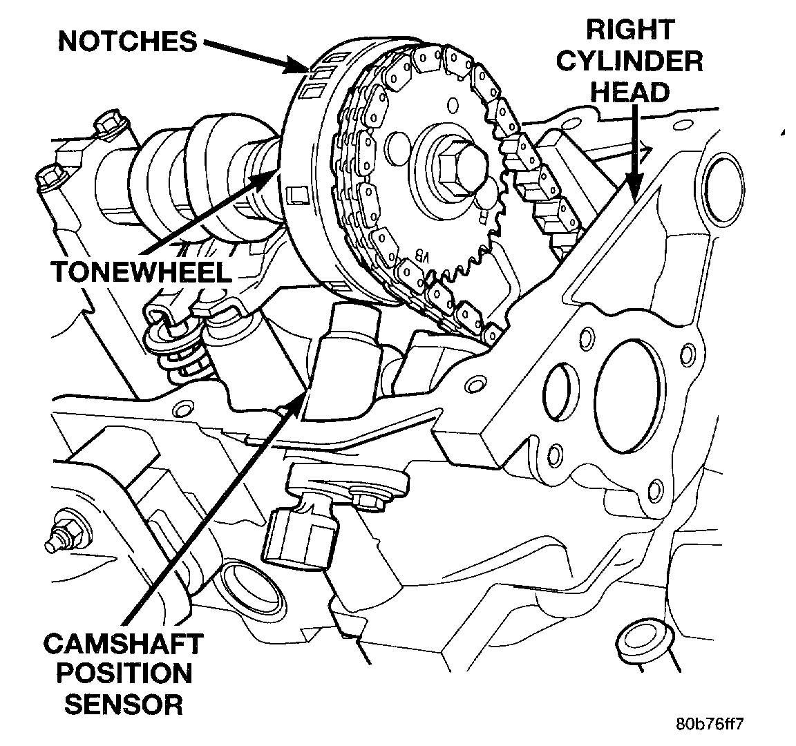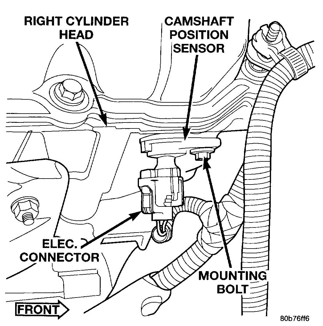 The Camshaft Position Sensor (CMP) is bolted to the front/top of the right cylinder head.