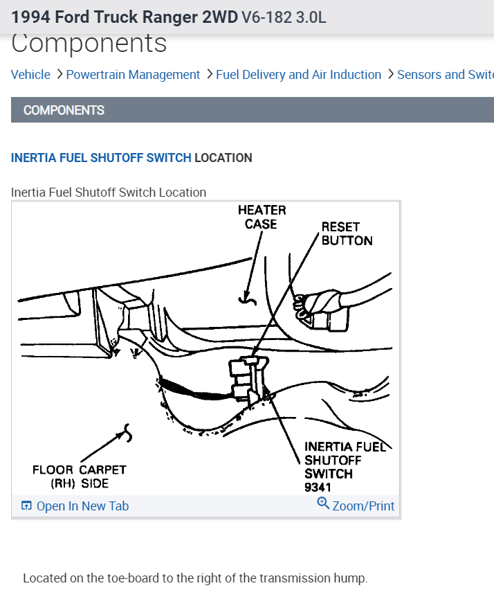 I'm going to do a fuel press check on my ranger. The manual reads that in order for the pressure to be relieved, I have to unplug the fuel pump switch. According to the manual, the switch is "directly behind the glove compartment". Can't find it. Do you guys have an idea of the location and what does it look like? Thanks a lot for your help. It is greatly appreciated.