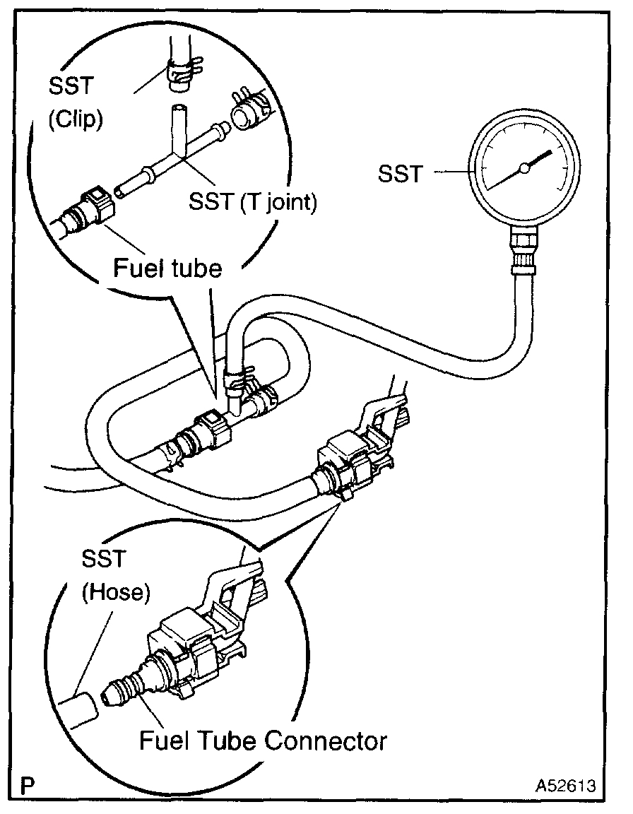 e. Install SST (pressure gauge) as shown in the illustration by using SST and fuel tube connector.