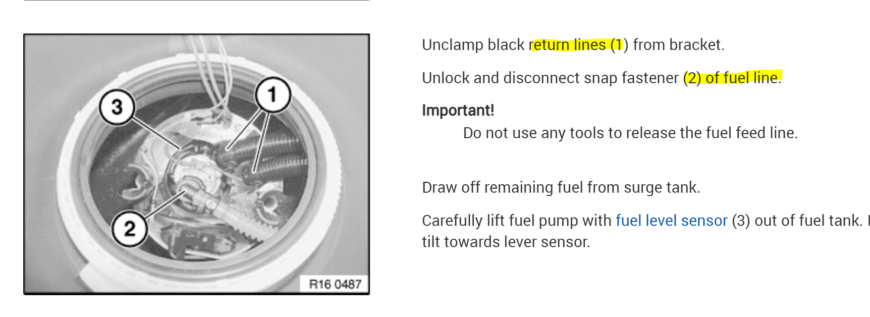 I attached a pic below of the fuel pump sending unit. It shows the return lines and the supply line. Which ones have fuel, and which don't? Also, let me know if that is what you are seeing. That is the US version. I just need to be sure we are on the same vehicle. LOL They change things based on destination.