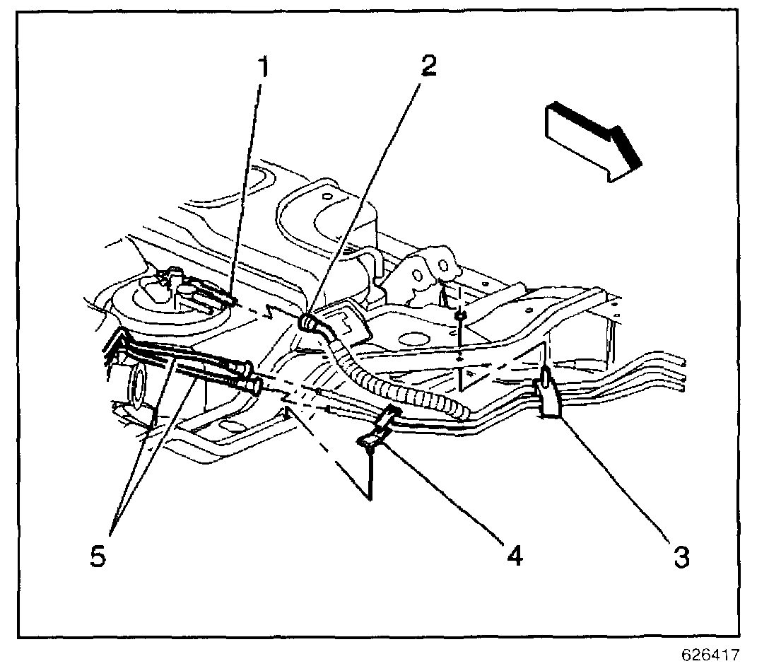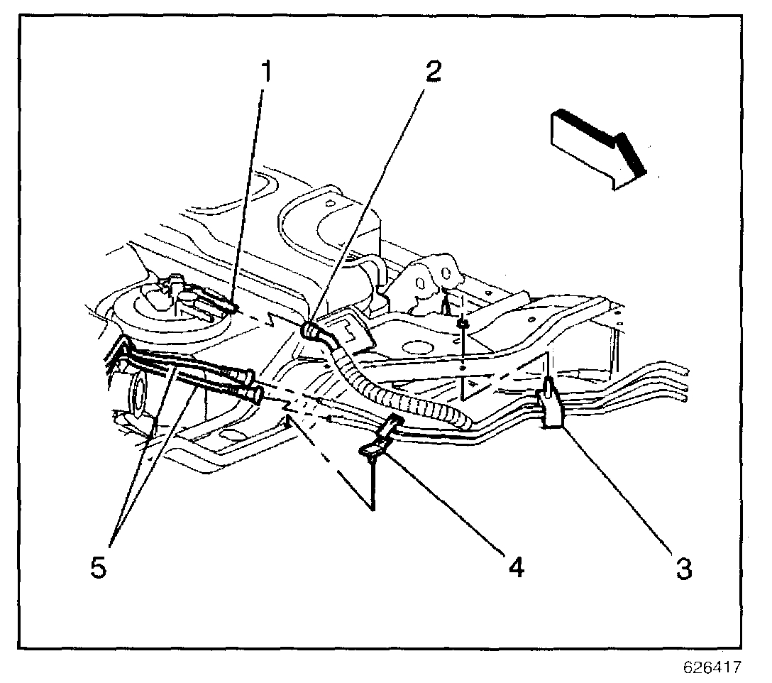 8. Disconnect the evaporative emission (EVAP) pipes at the rear tank EVAP pipes (5).