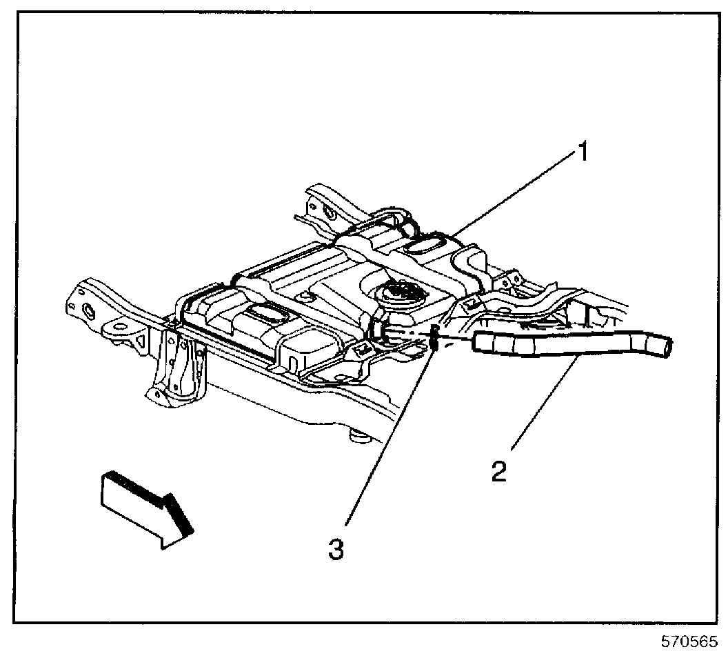 1. Connect the EVAP pipe to the fuel tank roll over valves (1,3) and the retaining clips (2).