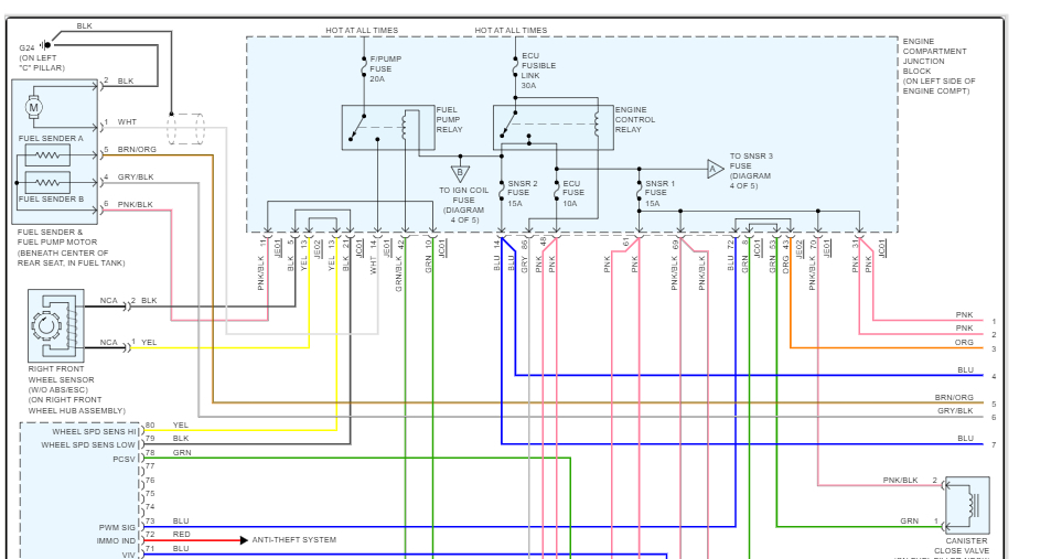 Here are the fuel pump wiring diagrams so you can see which wire to test for power. (White wire) test the wire while cranking the engine over.
