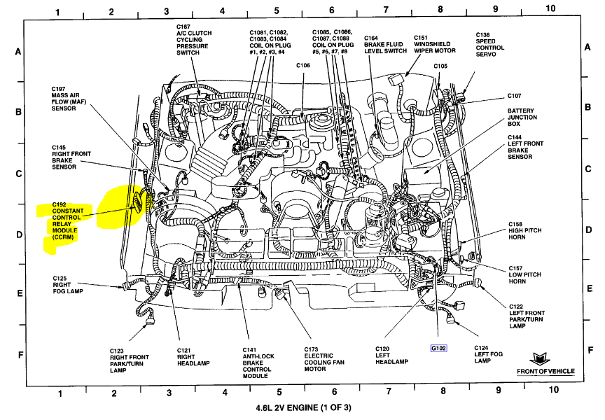 The Constant Control Relay Module (CCRM) contains the fuel pump relay, which supplies power to the fuel pump driver module (FPDM). If any of the internal components of the CCRM fail, the entire unit must be replaced.