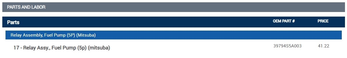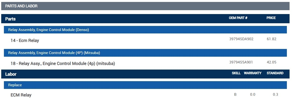 Relay part numbers: 39794-S5A-901 and 39794-S5A-003. I think my next step is Honda Dealer service department to scan system for ECM data. If they put new ECM in, I would be interested in having the old unit repaired if possible. Thanks, I will keep you posted.
