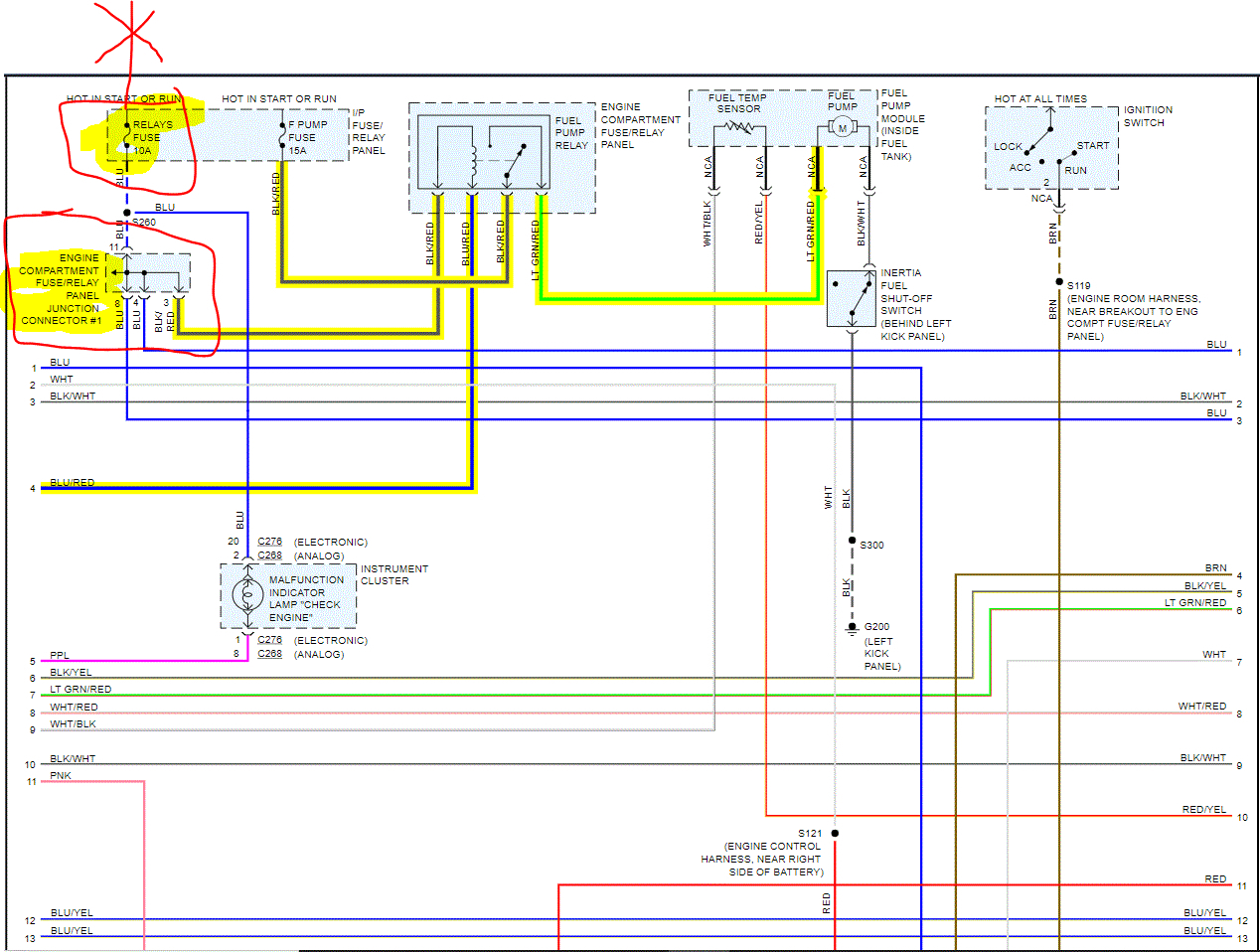 If you are not getting power to the light green/red wire, either the internal contact switch in the relay isn't closing, there is no power to the black/red at that portion of the relay, the connector to the light green wire is bad, or the fuse is bad.