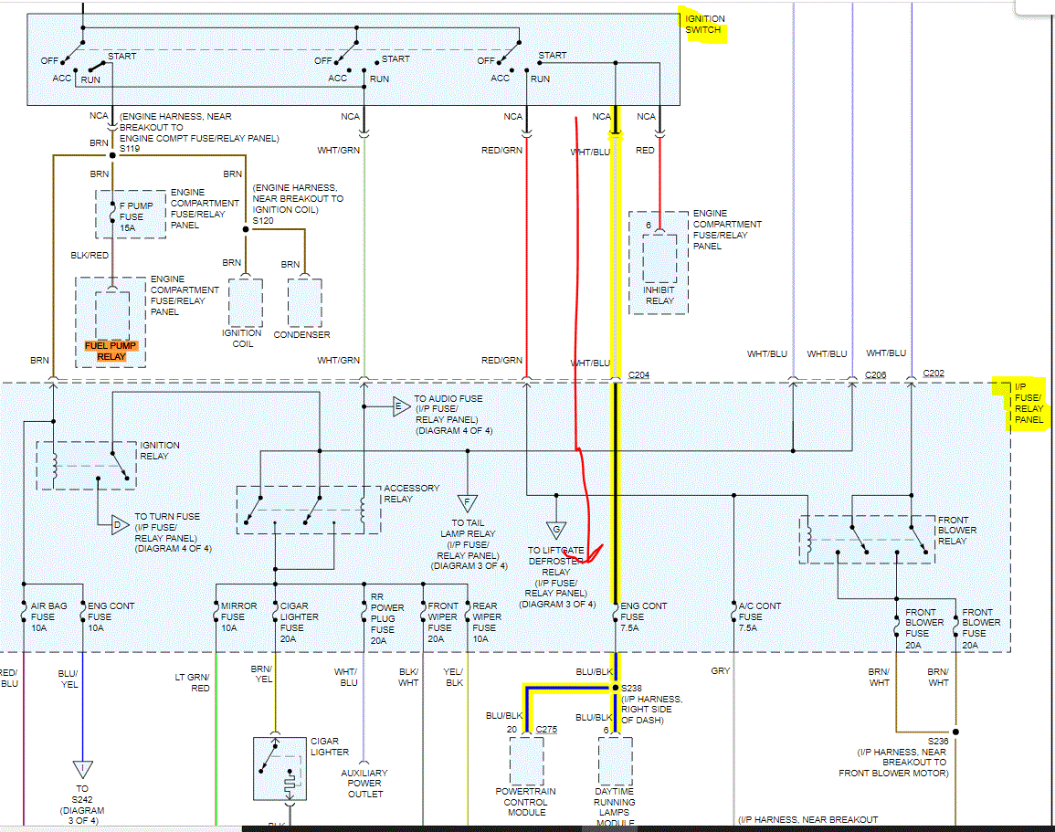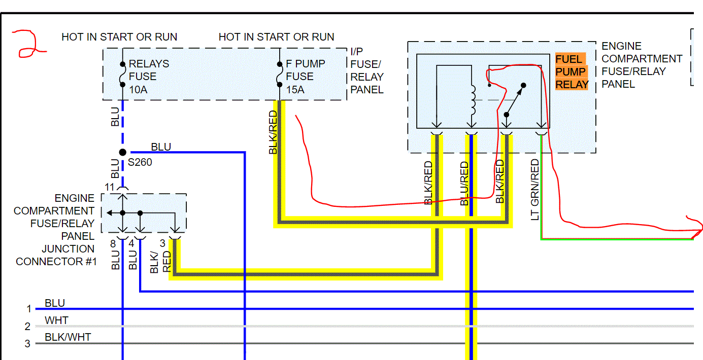 Take a look at the pic below. When you turn the key to the on or start position, power is supplied via both black/red wires. The blue/red completes the circuit for the relay. Once power goes in the black/red wire (left side of relay pic, 1) the circuit is completed by the blue/red wire. That draws the relay switch into the closed position (right side switched section of the relay). Once that internal switch is closed in the relay, power then runs from the fuel pump fuse, through the right section of the relay, and out the light green/red wire to the pump.