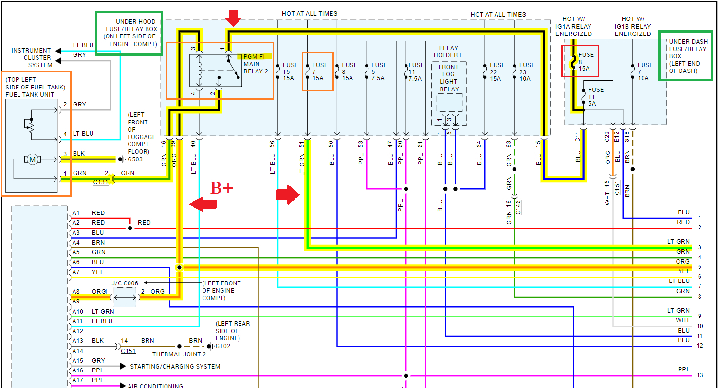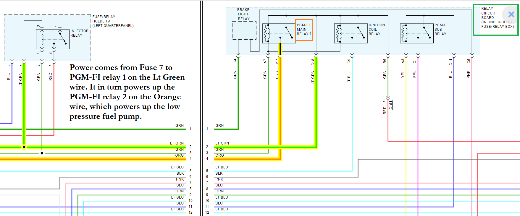 The low-pressure pump is powered by the PGM-FI Main Relay 2, I'll post a diagram for it, there will be a plastic or rubber fuel line coming into the high-pressure fuel pump, and that's where you would take a fuel pressure reading to check if the pump in the tank is working.