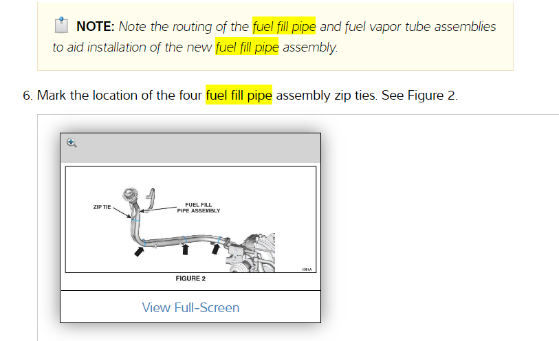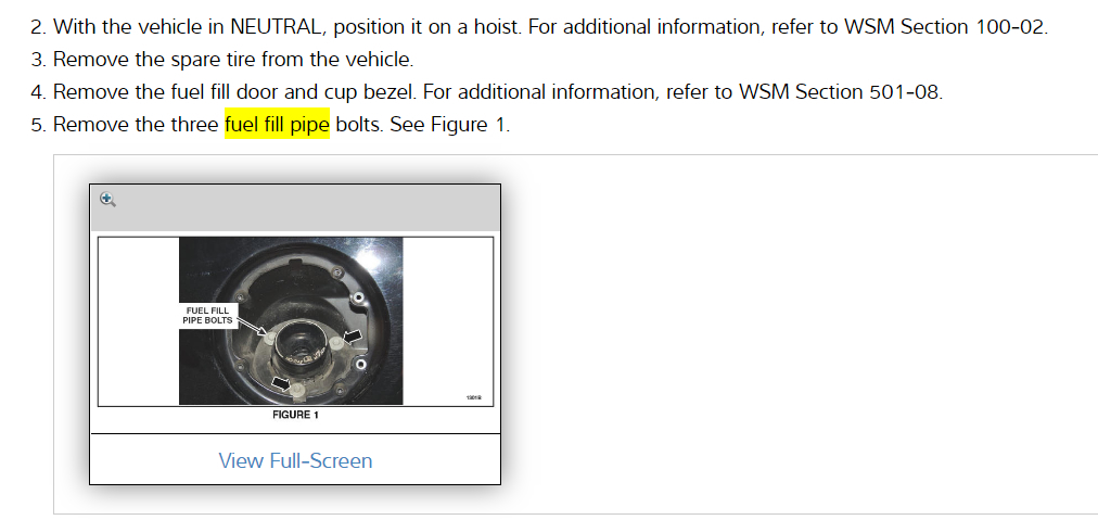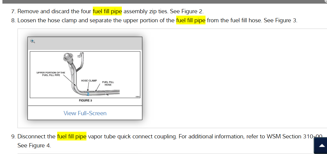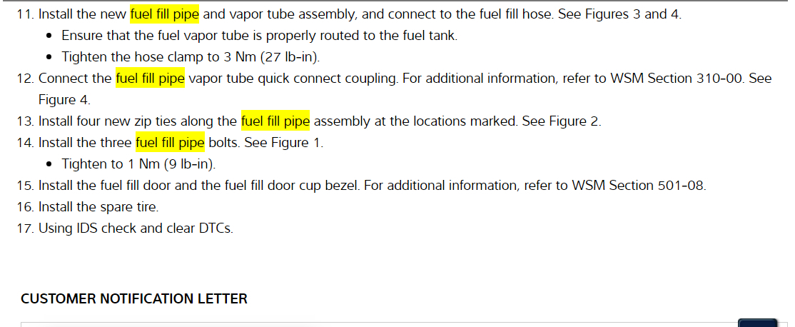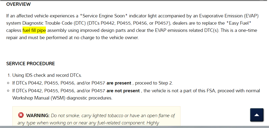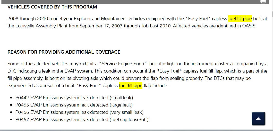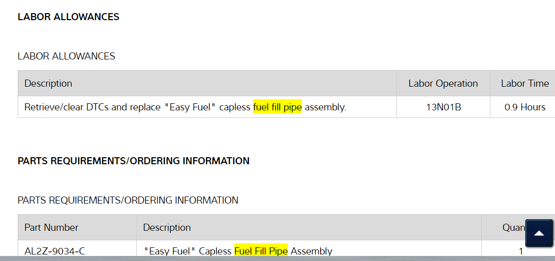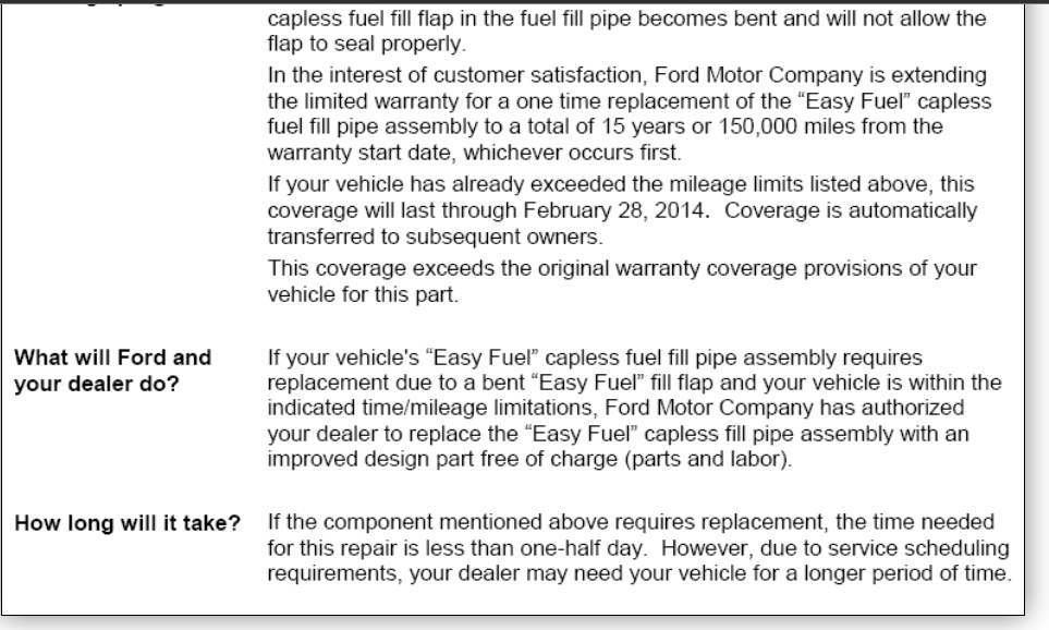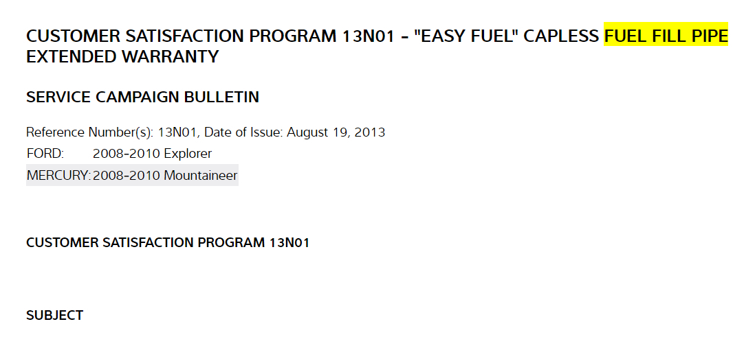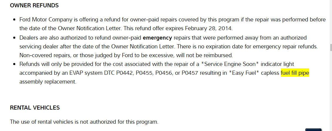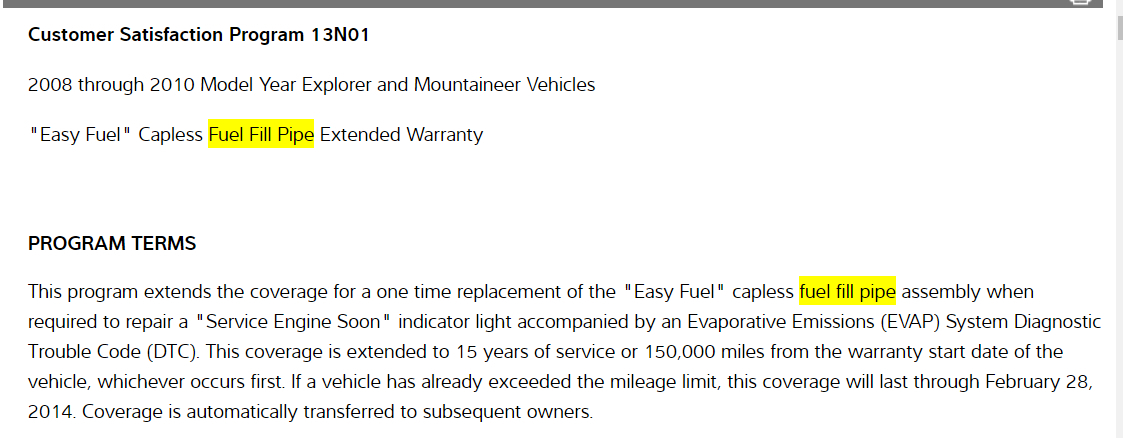 I have included for you in the diagrams down below a Technical Service Bulletin (TSB) i came across while doing some research for your vehicle. It is a recall notice to have your fuel filler neck replaced free of charge by The Ford Motor Company. All you need to do is call your local dealership, give them your particulars, and go have it fixed. Please let us know how it goes, we are interested to hear about it.