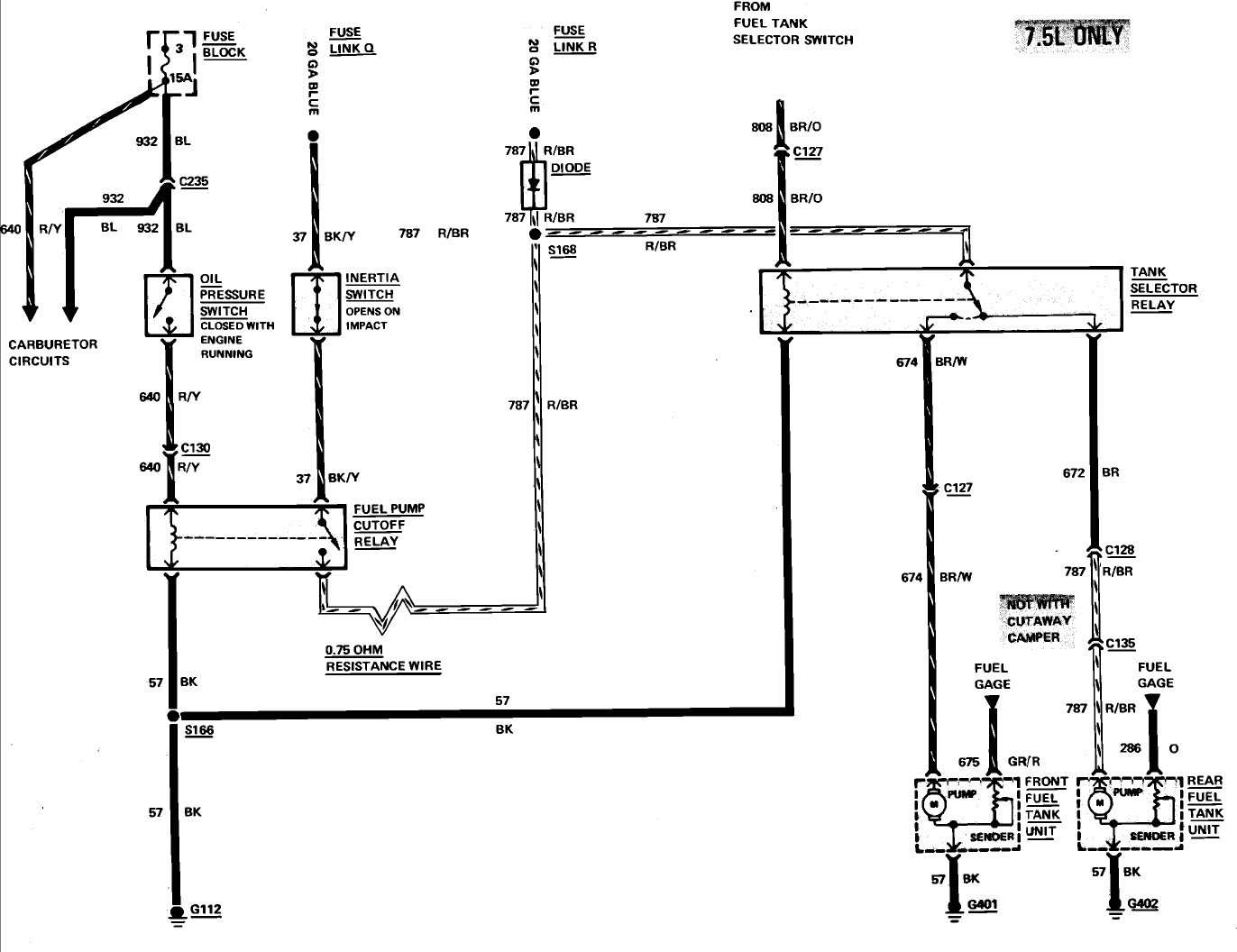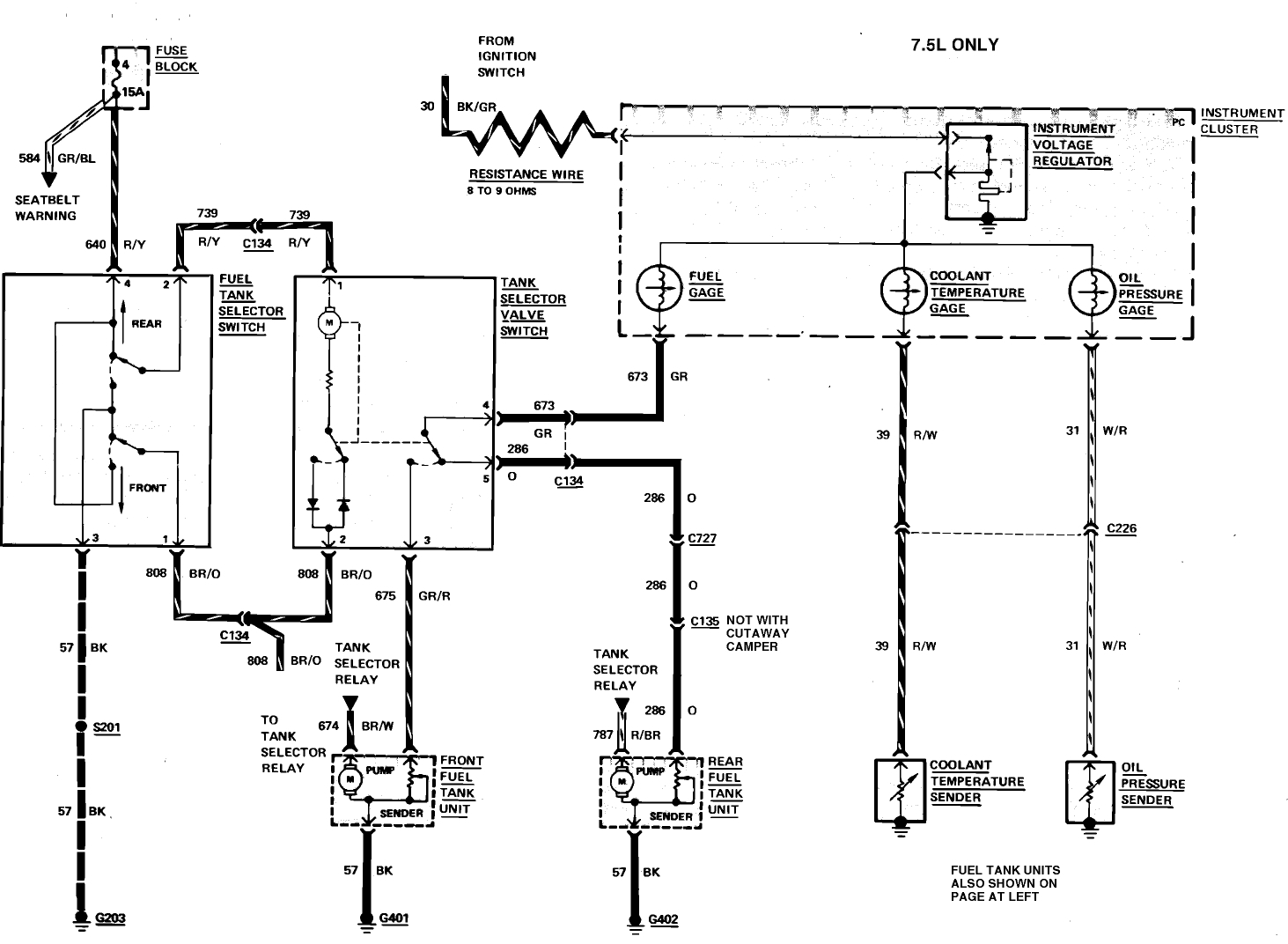 I replaced fuel pumps and sending units, both tanks. Rear tank did not work, still does not. I started tracing wires, some change colors, some just stop. The dash selector is 11.8 VDC when front selected, 8.1 VDC when rear is on. I cannot even find a good pinout drawing of the selector valve, or wiring diagram.