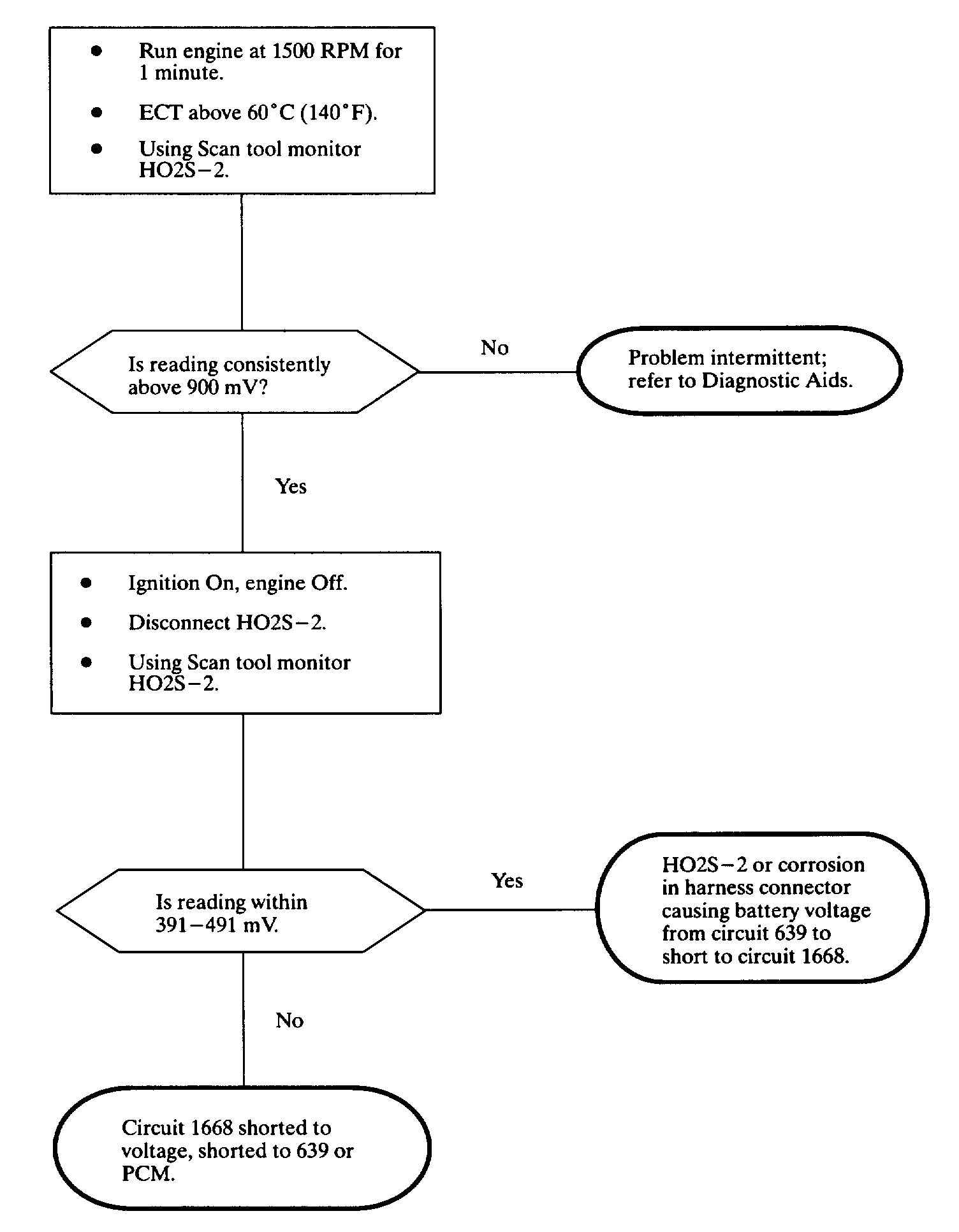 To locate an intermittent problem, use Scan tool to monitor HO2S-2 voltage with engine idling at normal operating temperature. Wiggling wires while watching for a change in HO2S-2 voltage may locate the area where a short to voltage in the wiring could lie.