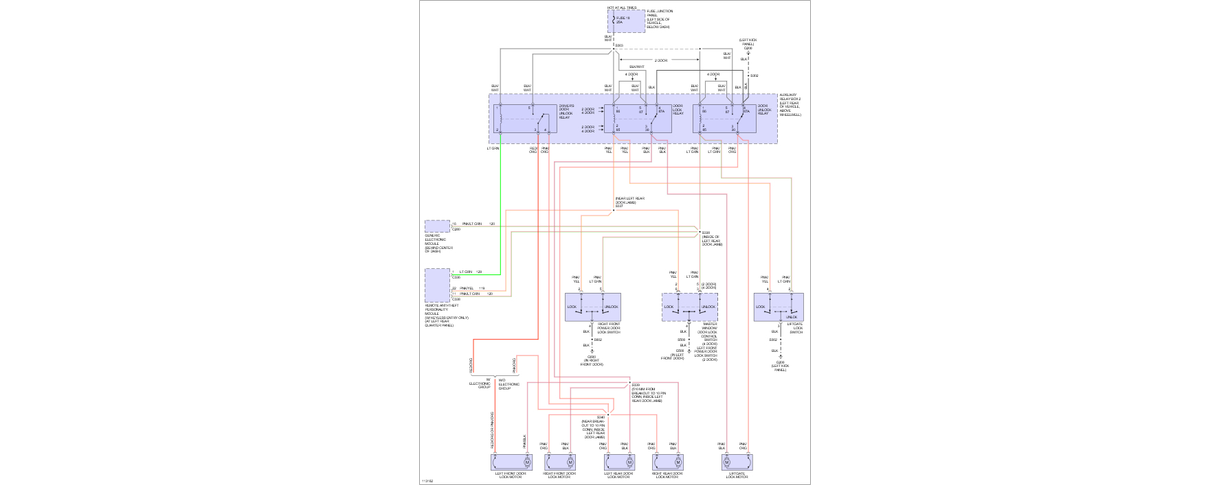 Okay, looking at the wiring diagram, it appears it could be either a short in the remote anti-theft personality module and any of the door lock/motors. so try disconnecting all of them then put the fuse and relay in and when the fuse stops blowing, hook back up each individual item until again you narrow it down to which it is.