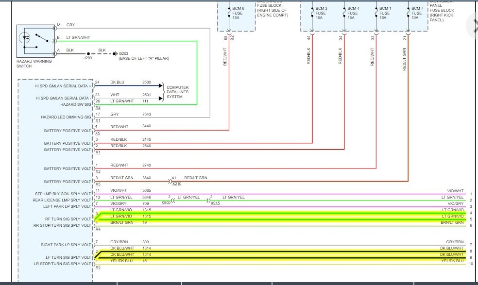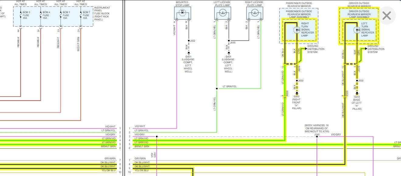 I attached the diagrams for you of the lights. The lights are controlled by the body control module which turns them on based on an input from the turn signal switch itself.