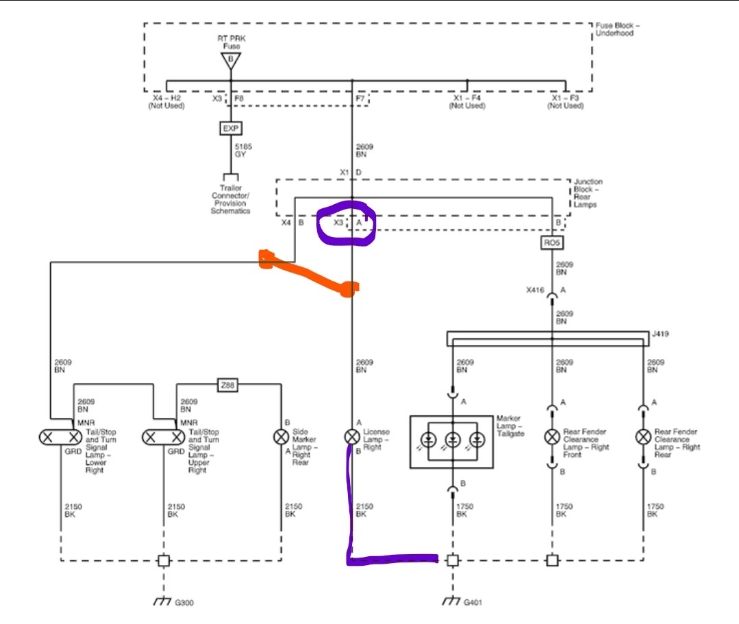 If the only lights that are out are the plate lights and the rear parking lights work, it isn't a fuse. They are both powered by the same fuses. All of them share the same feeds. The most likely area for the problem is corrosion in the lamp junction box in the rear of the truck in the left frame rail. The powers and grounds all go there and then out to the various lights, they corrode inside, and you get odd problems. The grounds are shared between the other taillights so it likely isn't those. However, an easy way to test them would be to pull the bulbs out and use a test light connected to power to touch each pin with the lights on. On the ground side (black wire) it should turn on if that is okay, then the feed side (brown) is the problem and it's likely the junction. If you don't want to fight with it and the ground sides test okay, you could just pick the brown lead off the right and the left and connect them to the correct sides using jumper wires to the brown wires at each taillight.