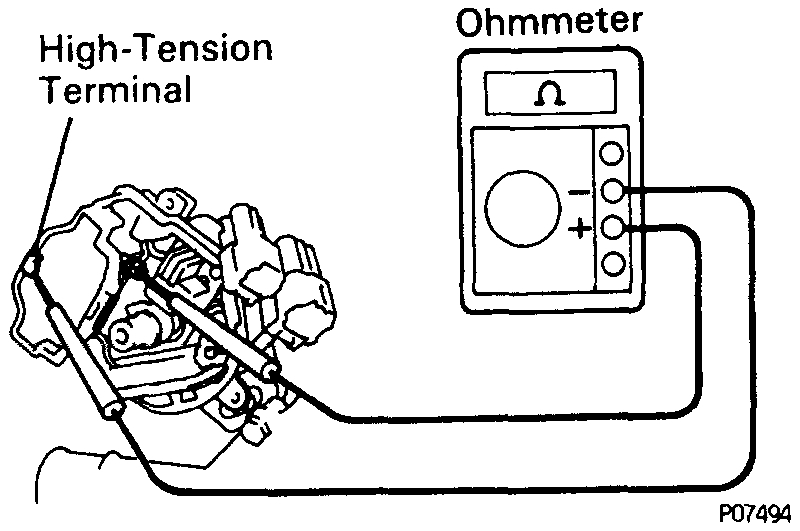 - Using an ohmmeter, measure the resistance between the positive (+) and high-tension terminals.