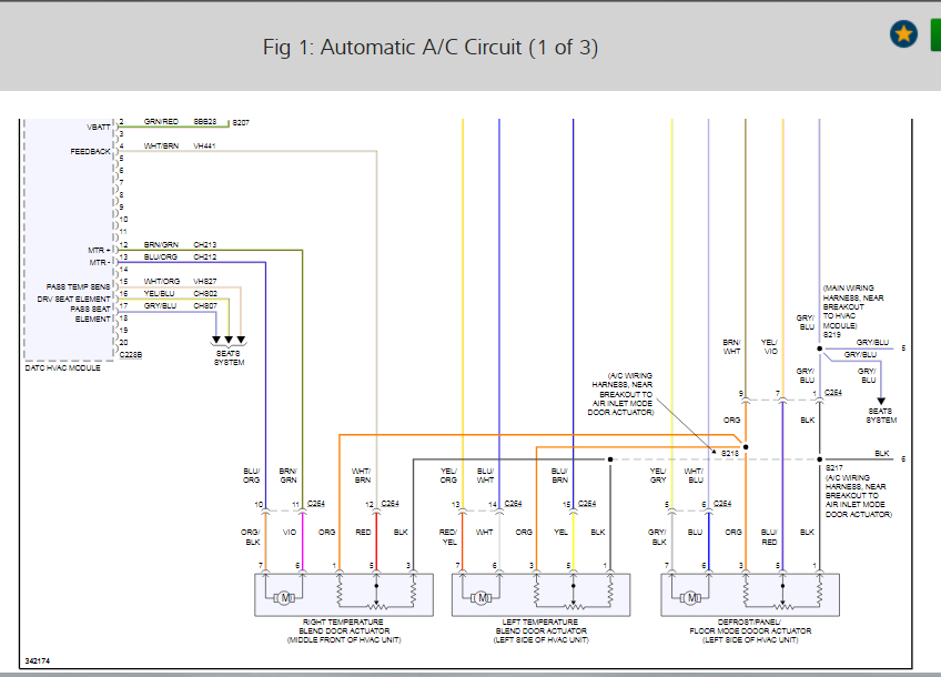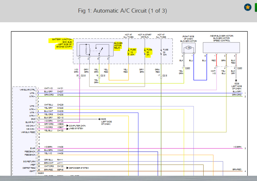 In the diagrams down below I have included the Heating Ventilation and Air Conditioning (HVAC) wiring diagram for you with the blower motor, the fuses that go to the blower motor, and the blower motor relay on it. Please note that I have highlighted the fuses and the relay and there location, which is in the Battery Junction Box on the left side of the engine compartment. Please go through this wiring diagram and get back to us with what you are able to find out.