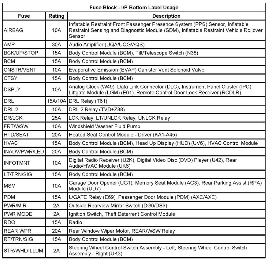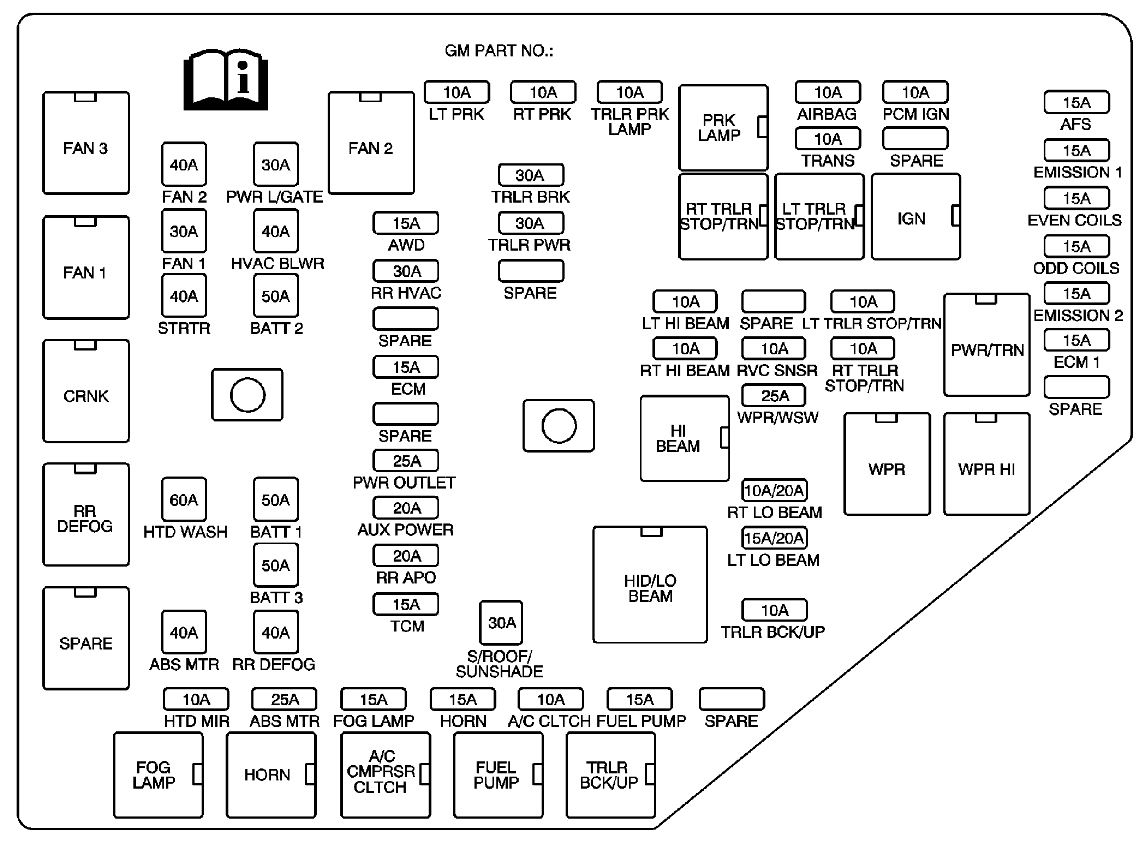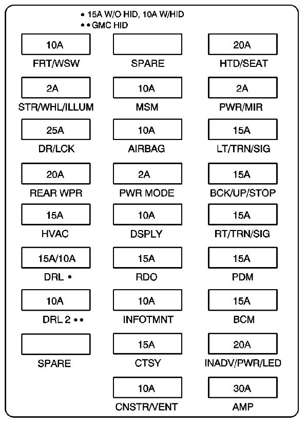 There are two boxes on that vehicle. One is under the hood at the power center and the other is in the passenger side under the instrument panel. Below you will find images of the fuse boxes and what the fuses power.