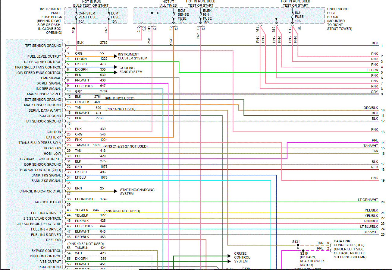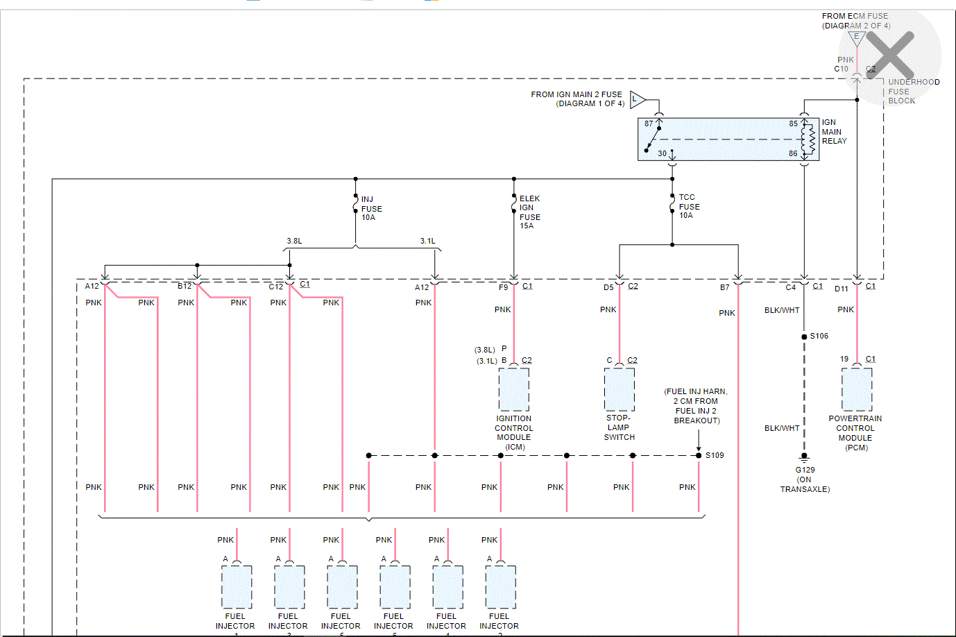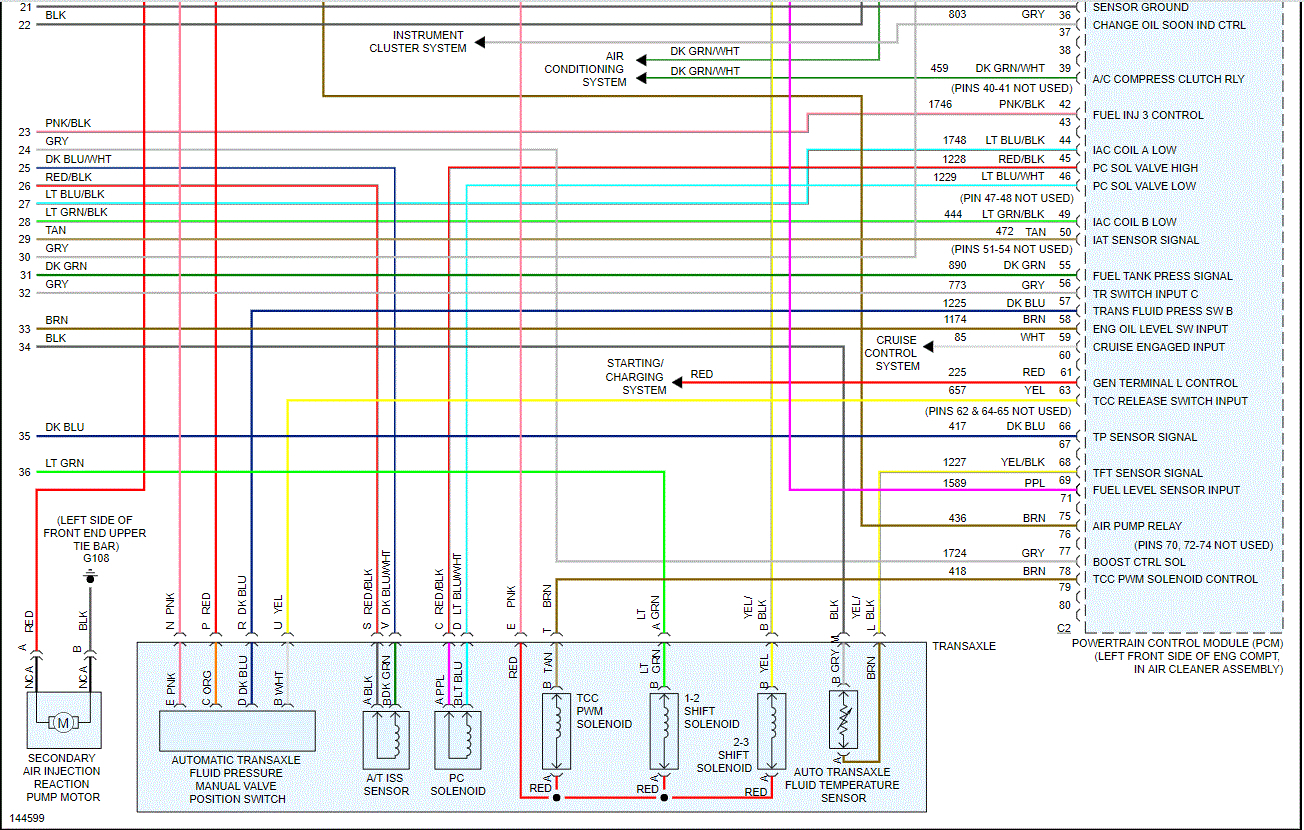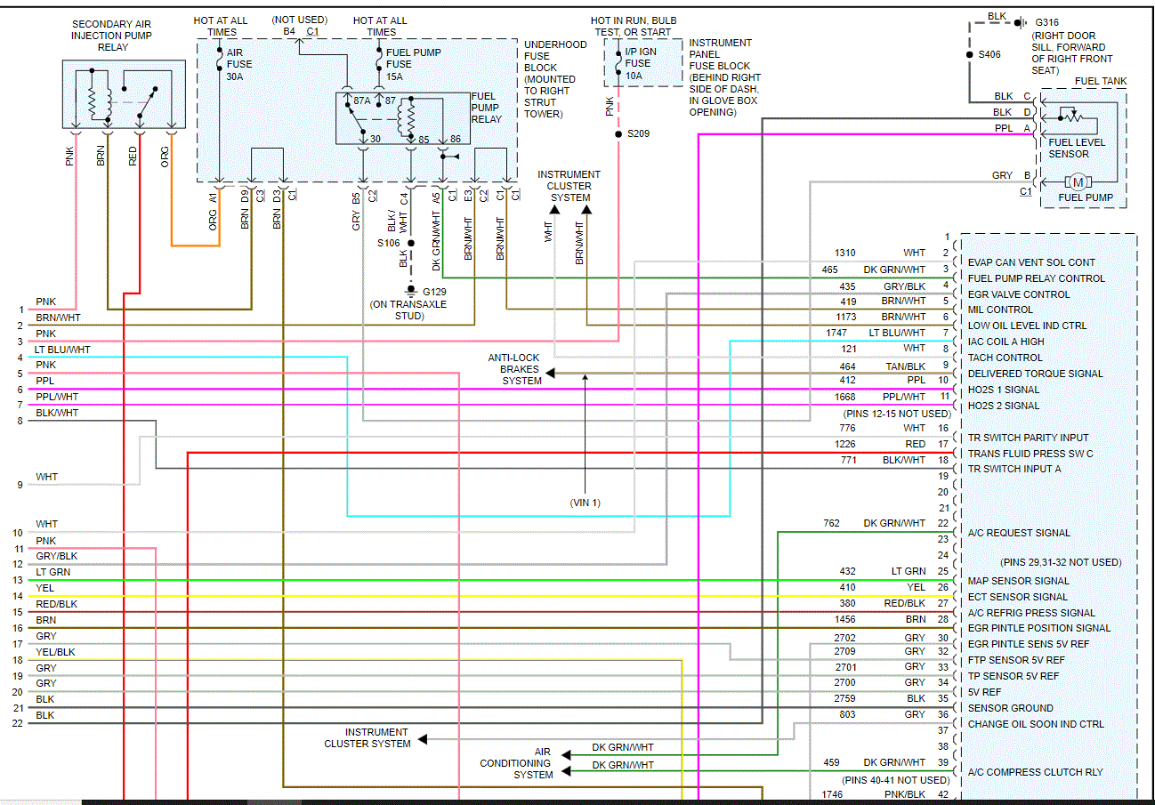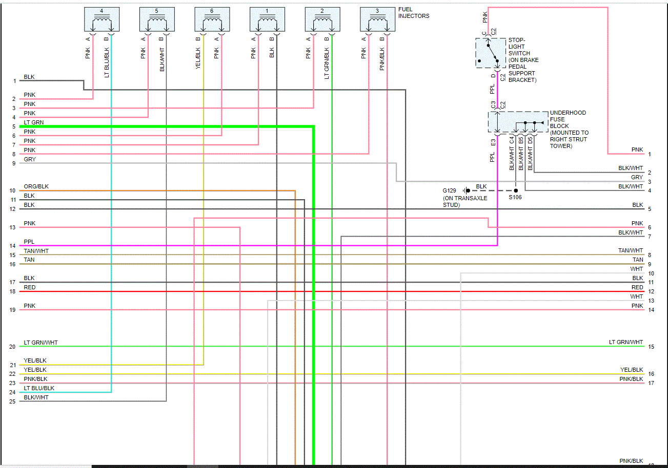 If you look at the pics below, I included the entire powertrain management wiring schematic. I had to cut the pics in half to make them readable for you. However, I did overlap them so you can follow them easier.