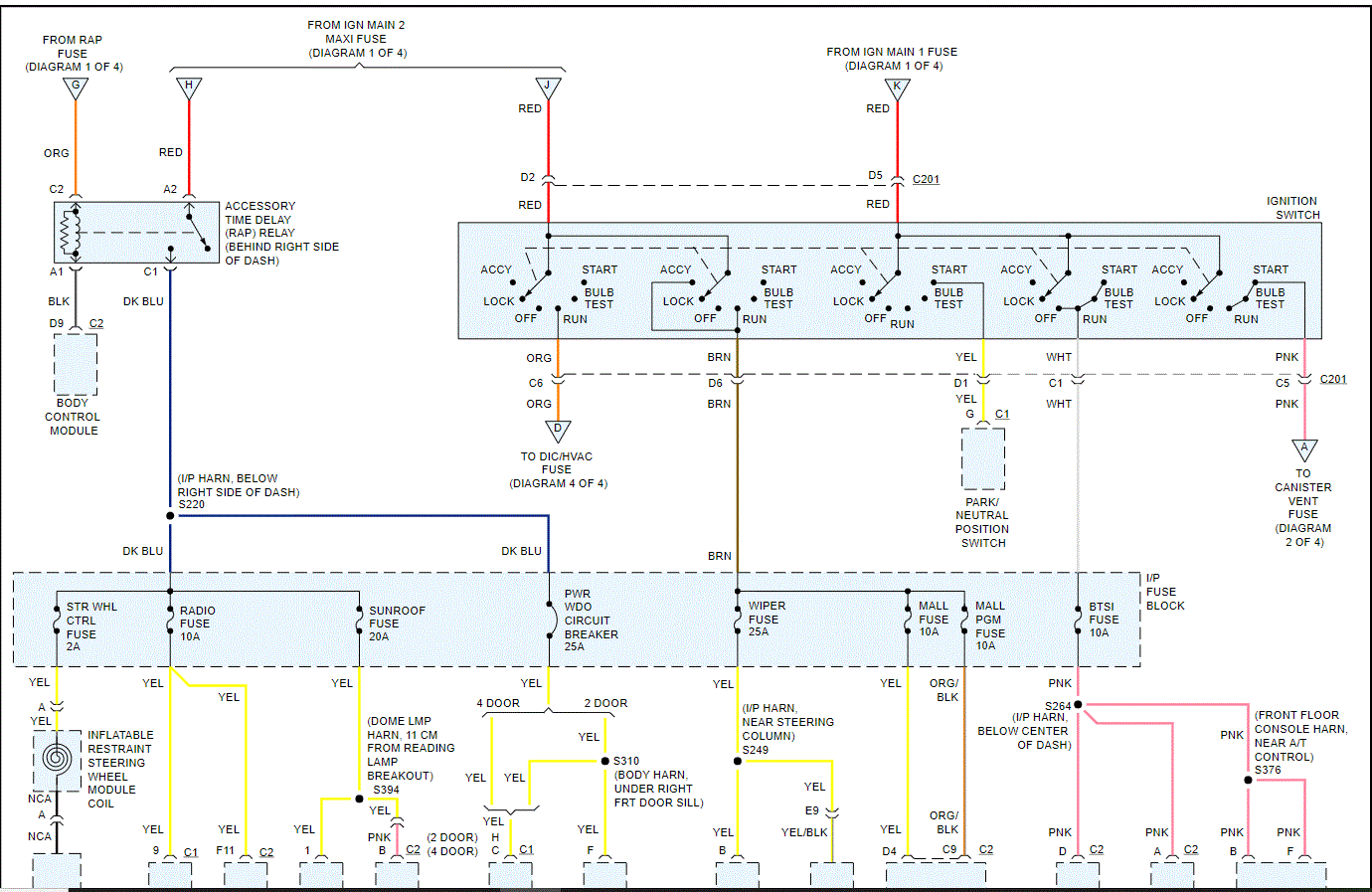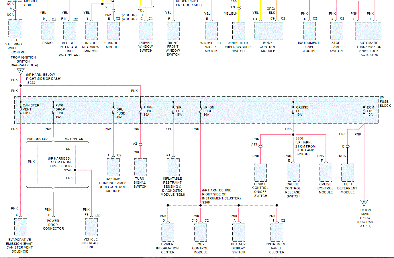The best I'm going to be able to do is a power distribution schematic. I cut the pics in half to make them readable. I did overlap them so you can follow. What you have to do is pay attention to where the power supply leads. The first pic shows a portion of the fuse box but if you continue following, it jumps to other areas in the box. It also includes the IP fuse box.