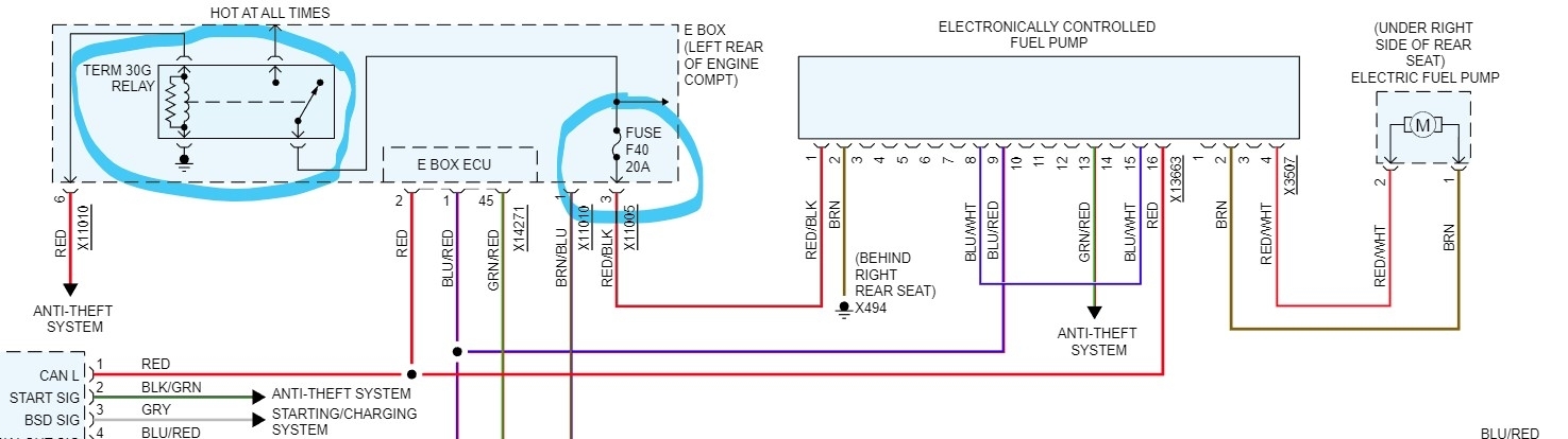 Here is an image showing the fuse number (40) and the box it is in (Ebox, left rear of engine compartment, pump relay is in the same box).
