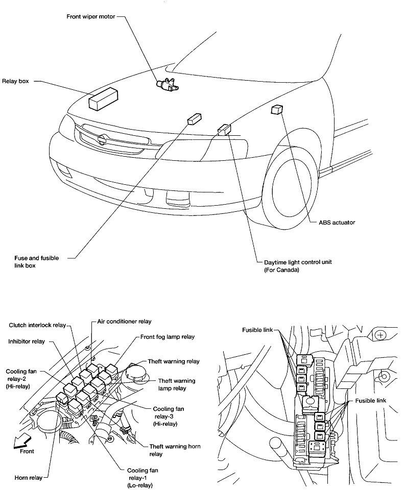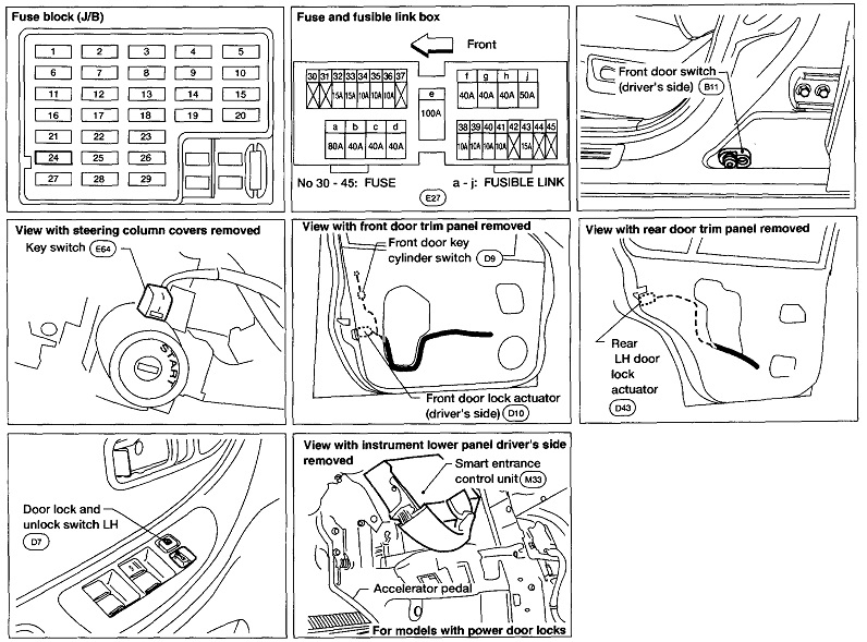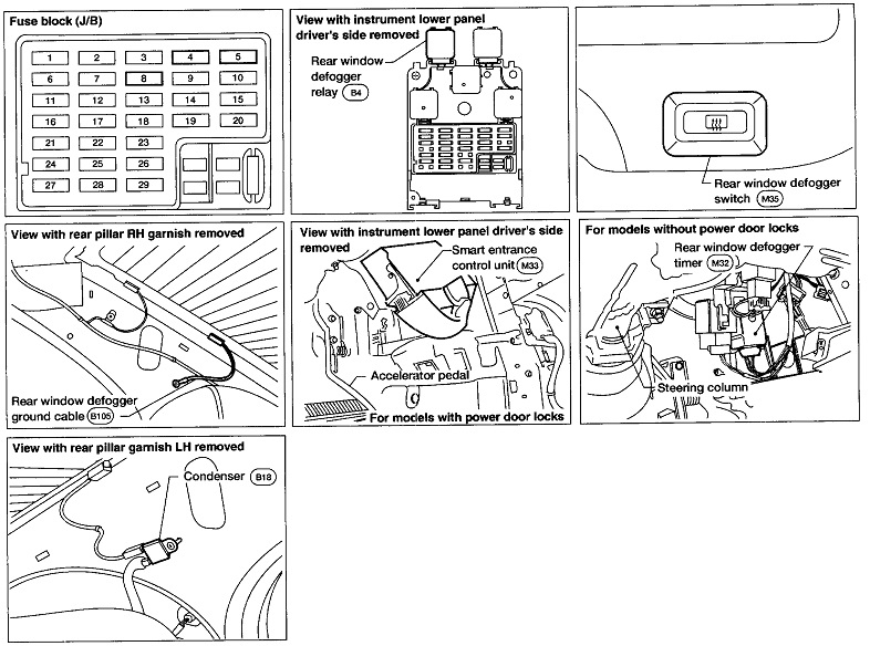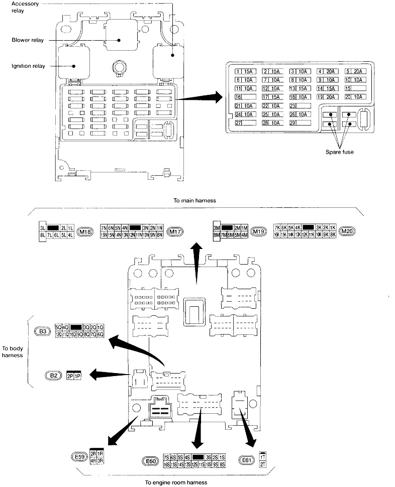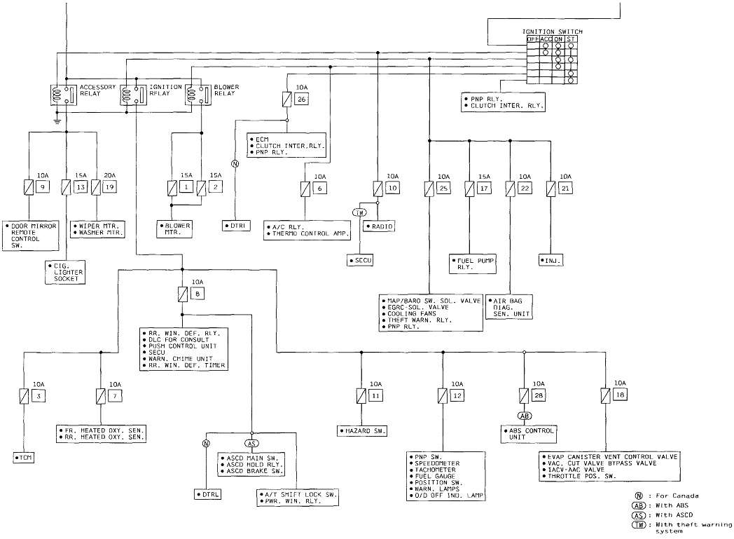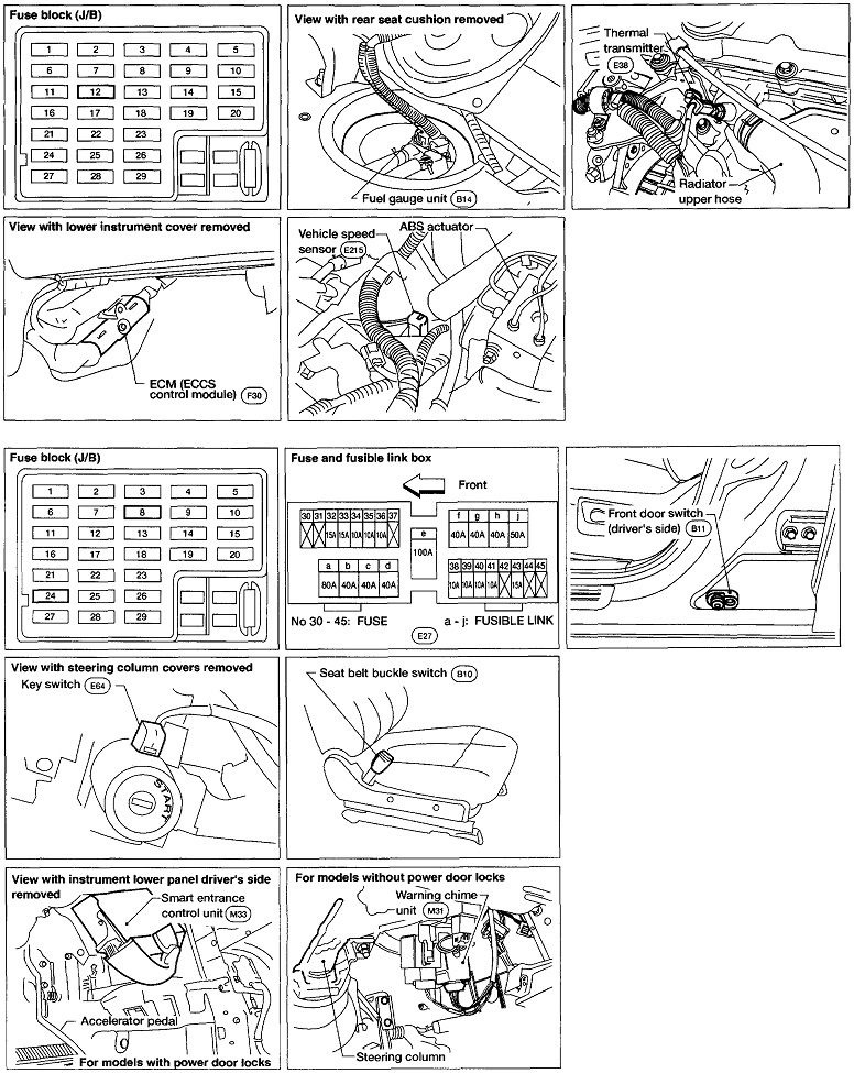 Believe it or not, the people at Nissan think the diagrams I posted are supposed to tell us that. If you look closely at any one of the diagrams, you'll see one or two fuses are represented by a box that's in bold, then the other drawings show the items protected by those fuses. I searched again and everything leads back to those drawings. There are a few others that have even less information and are pretty much useless.