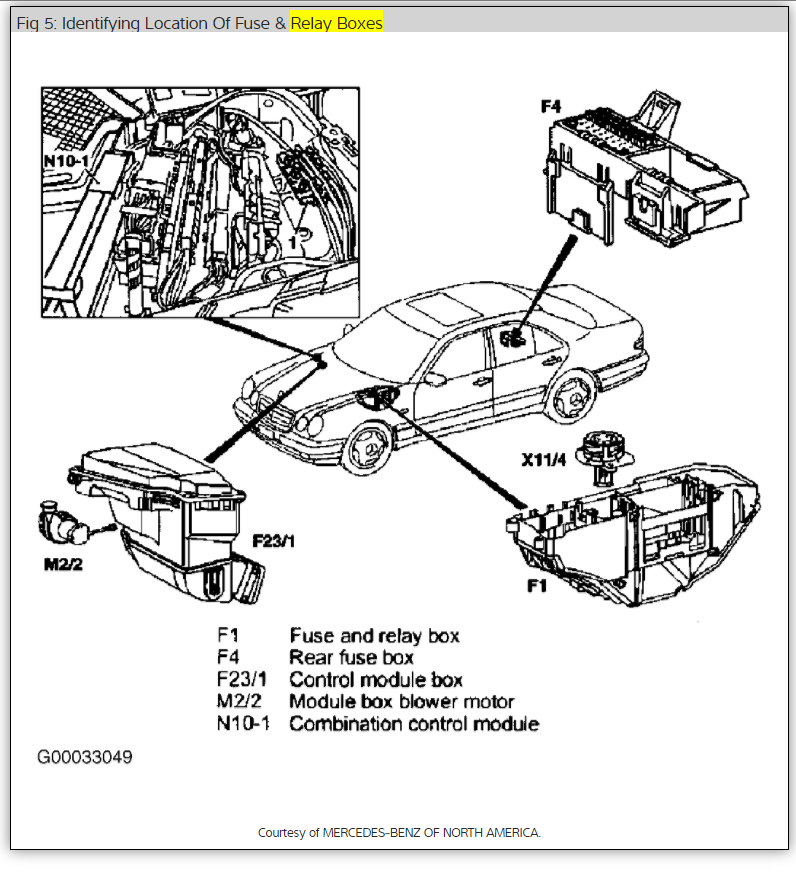 Where is fuse box for radio and cigarette lighter for 2002 Mercedes Benz E320?