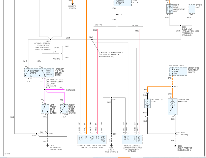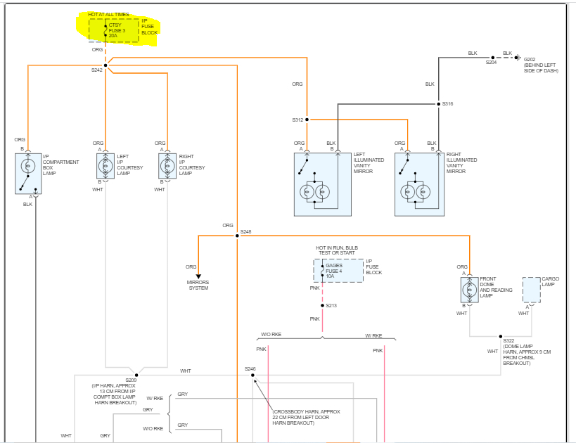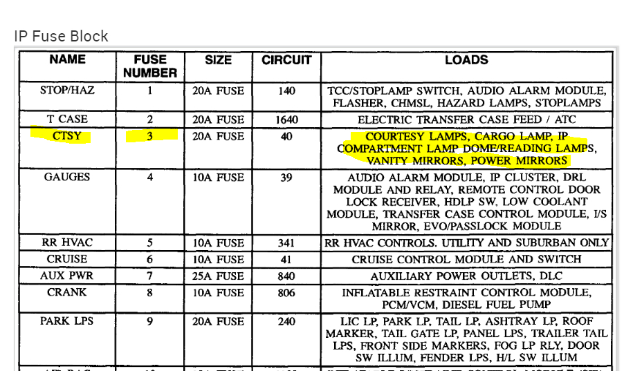 The fuse for the interior courtesy lamps is in the instrument panel fuse box. It will be fuse 3 in the box. If you look at the last two pics below, I highlighted the fuse and highlighted everything it powers.
