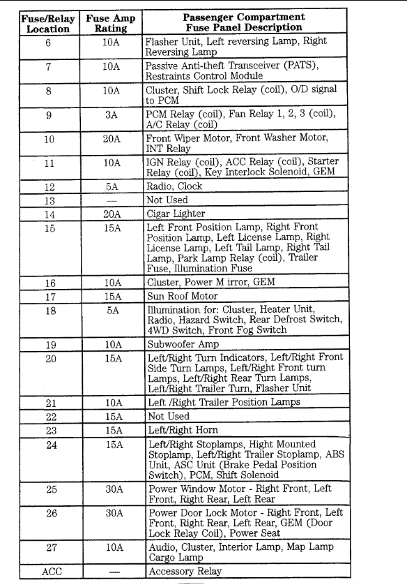 There are four fuses total. Two are in the fuse box at the left side of the dash, those are fuses 8 and 27. Both 10 amp. Then there are two more under the hood in the battery junction box on the drivers side. Those are fuses 11 (15 amp) and FB (120 amp).