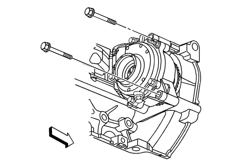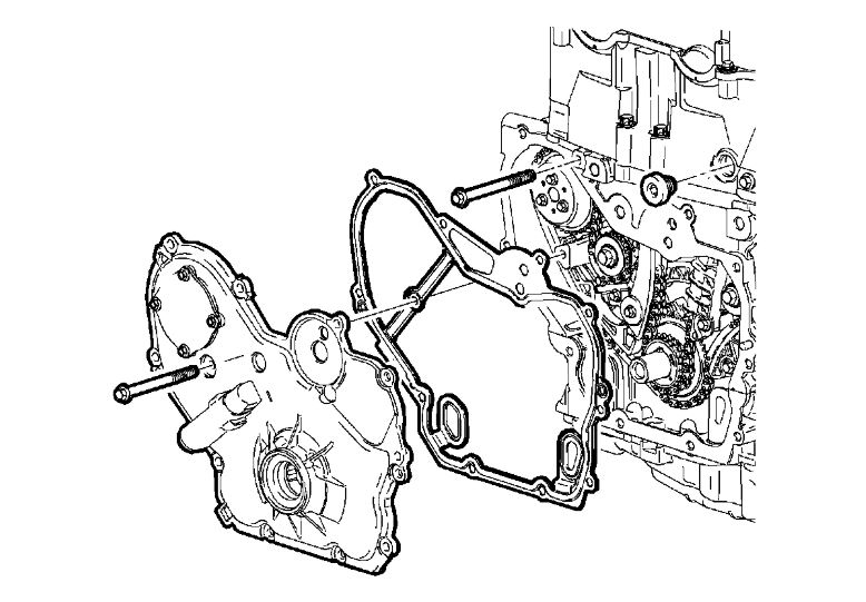 7. Install the access cover bolts that were removed earlier to secure the water pump holding tool to the front cover assembly.