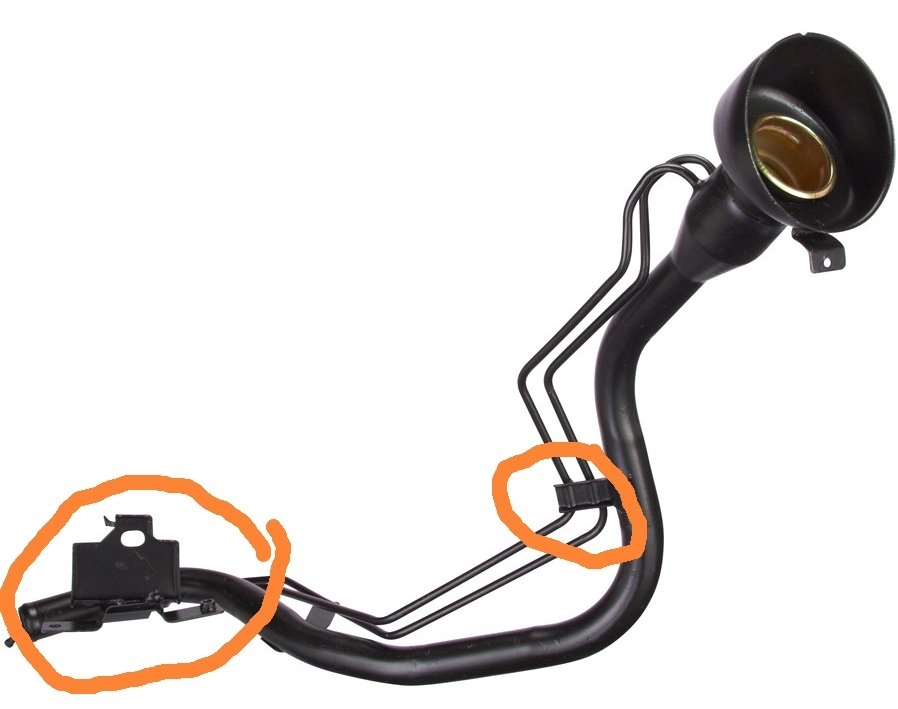 If you are in a salt state my bet is that the vapor vent tube has rusted through at the bottom. Salt and dirt collect there and the metal rusts. The two circled areas are usually where they leak.