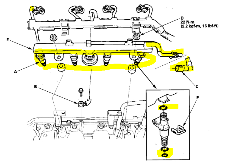 If the smell seems to come from under the hood, do the same thing. With the engine cold, cycle the key to the run position and see if there is any evidence of a fuel leak at the fuel injectors, fuel rail, or the fuel supply line. The only issue with this is the idea that the upper intake needs to be removed to access the injectors. But you should be able to tell if there is one. Pay attention to the supply line and keep in mind there are rubber O-rings at both the bottom and top of the injector that can fail. (See pic 2)