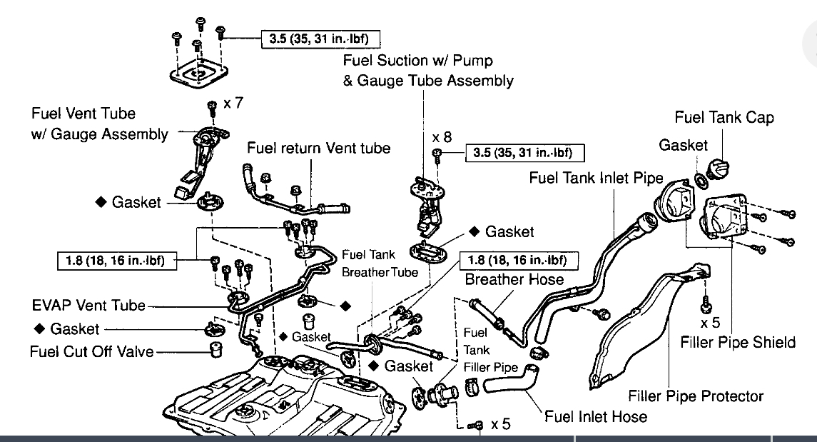 Toyota doesn't give instructions for the removal or installation of the fuel tank. But I have included an exploded diagram of the fuel tank and associated parts for you to refer to when removing and installing the fuel tank. Follow these general guidelines and you should be okay: