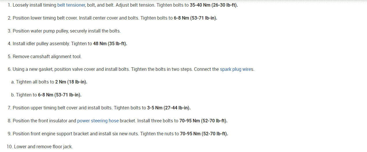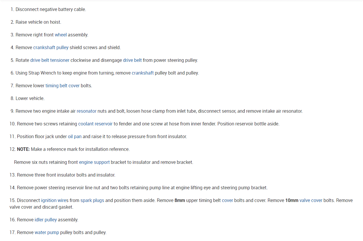 The camshaft timing belt needs to be removed. I am going to first give the directions for the pump replacement. After that, I will include the belt directions. You will need a couple of special tools to accurately time the cams. They are indicated in the directions. I believe you should be able to rent or borrow them from a parts store.