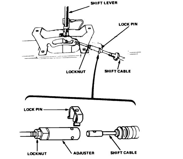 3. Ensure hole in adjuster is aligned with hole in shift cable. If holes are not aligned, loosen shift cable locknuts and adjust cable as required.
