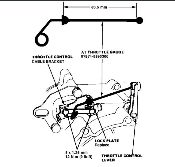 3. Position adjusting tool between bracket and throttle control lever as shown in Fig. 2. Tool 07974-6890300 is designed to provide 83.5 mm (3.287 inches) clearance between throttle control lever and cable bracket when tool is installed as shown in Fig. 2.