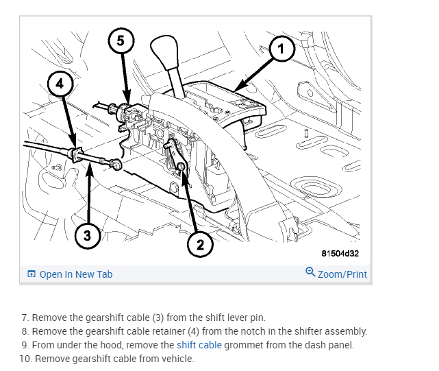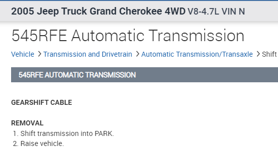The vehicle listed above is a Laredo. The gearshift cable is broken, and I would like to know how to change it. 4.7 automatic transmission.